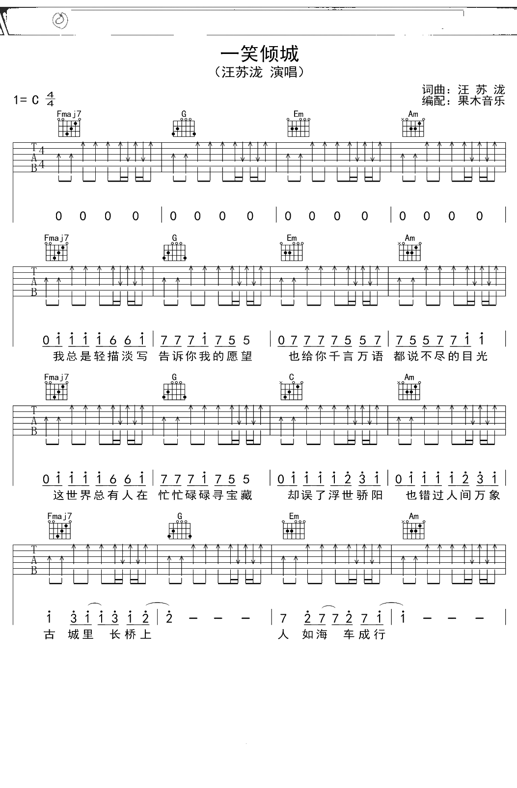 汪苏泷《一笑倾城》吉他谱 C调弹唱六线谱吉他谱