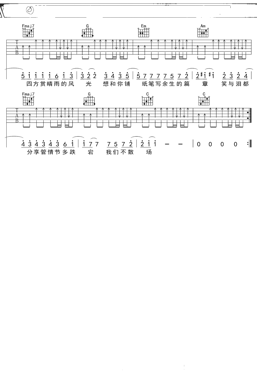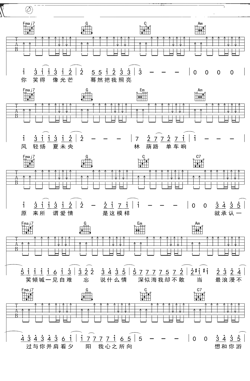 汪苏泷《一笑倾城》吉他谱 C调弹唱六线谱