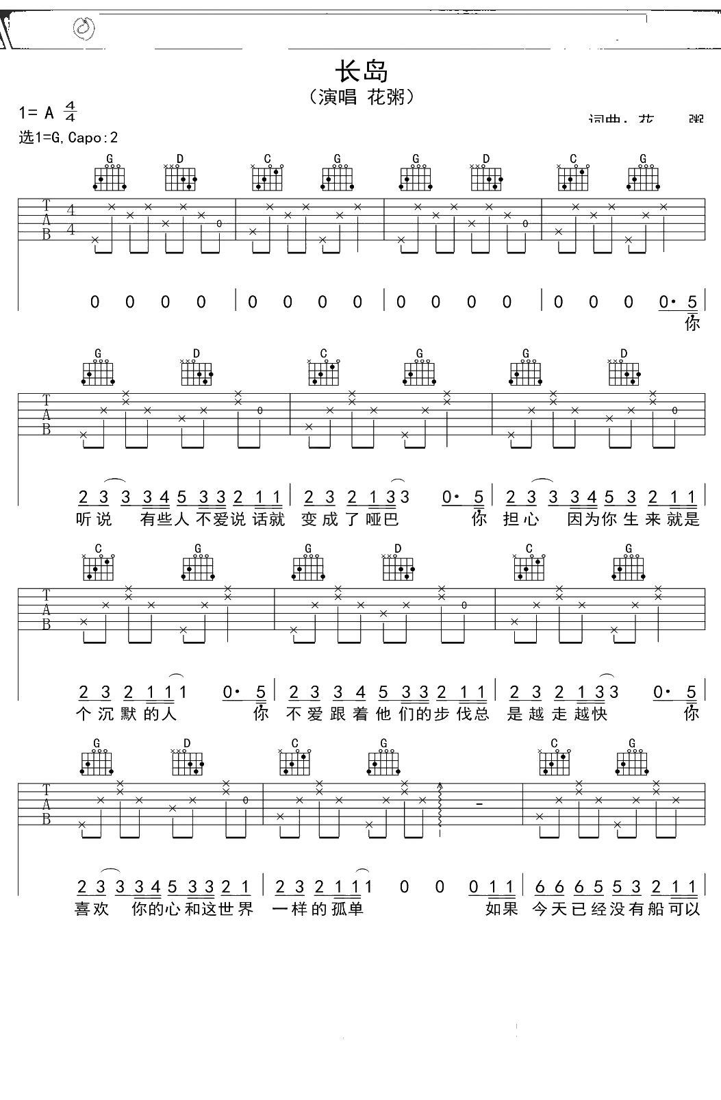 花粥《长岛》吉他谱 G调弹唱六线谱吉他谱