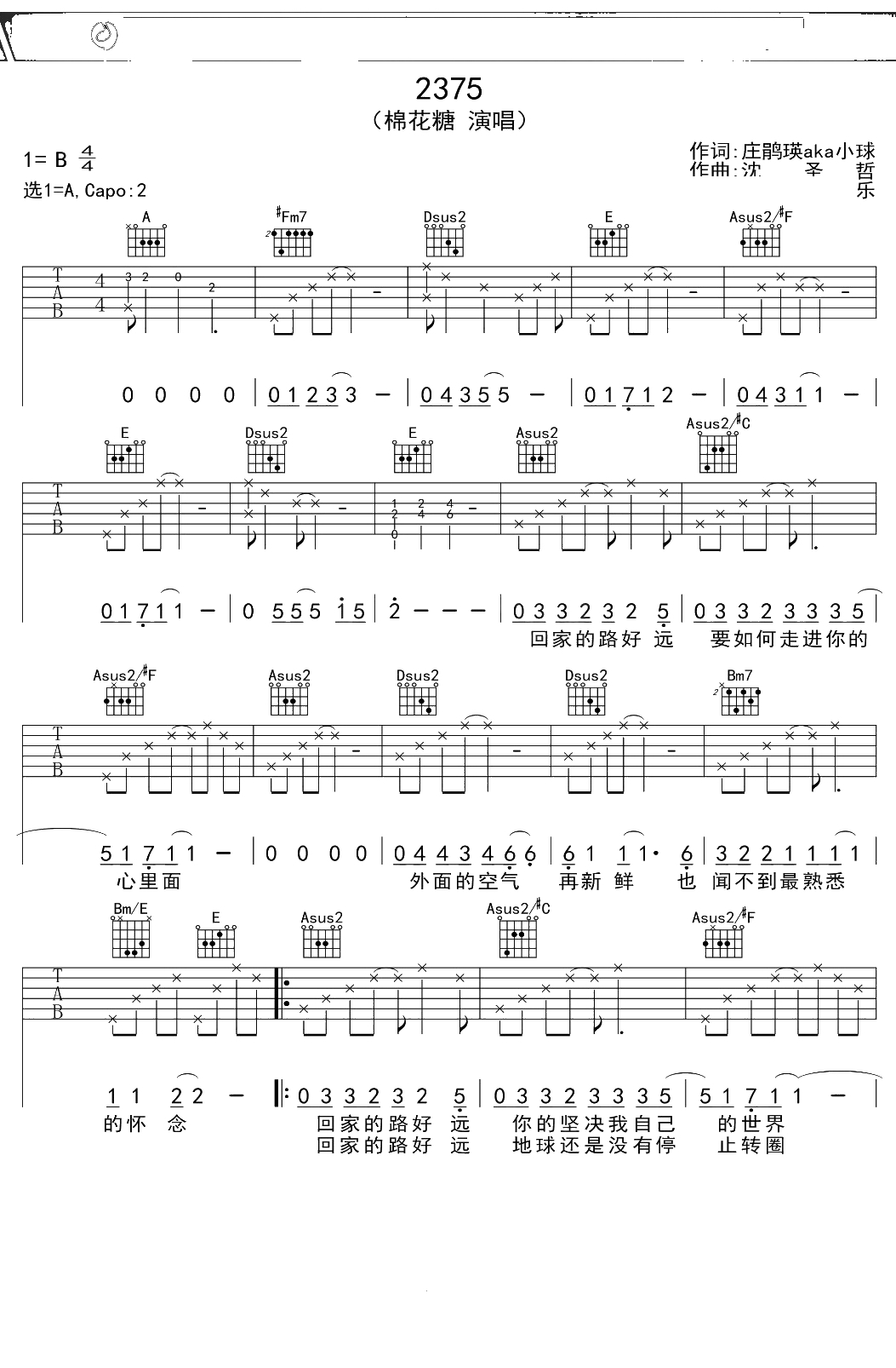 棉花糖《2375》吉他谱 A调弹唱六线谱