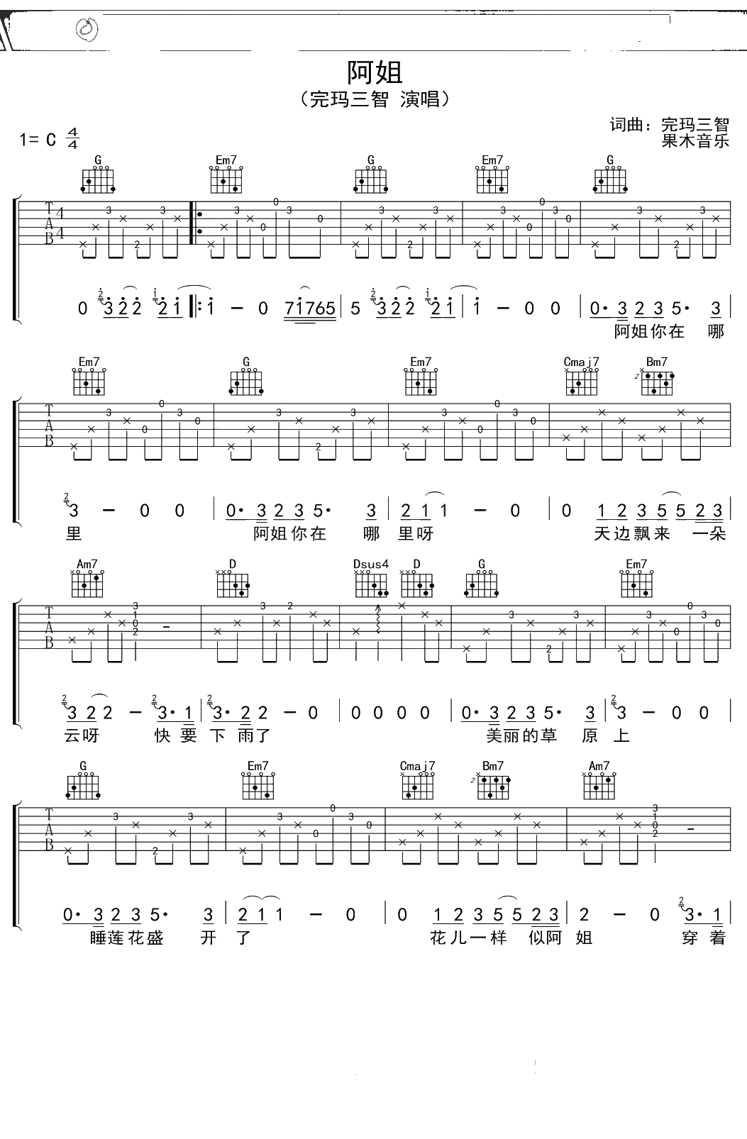 完玛三智《阿姐》吉他谱 C调弹唱六线谱