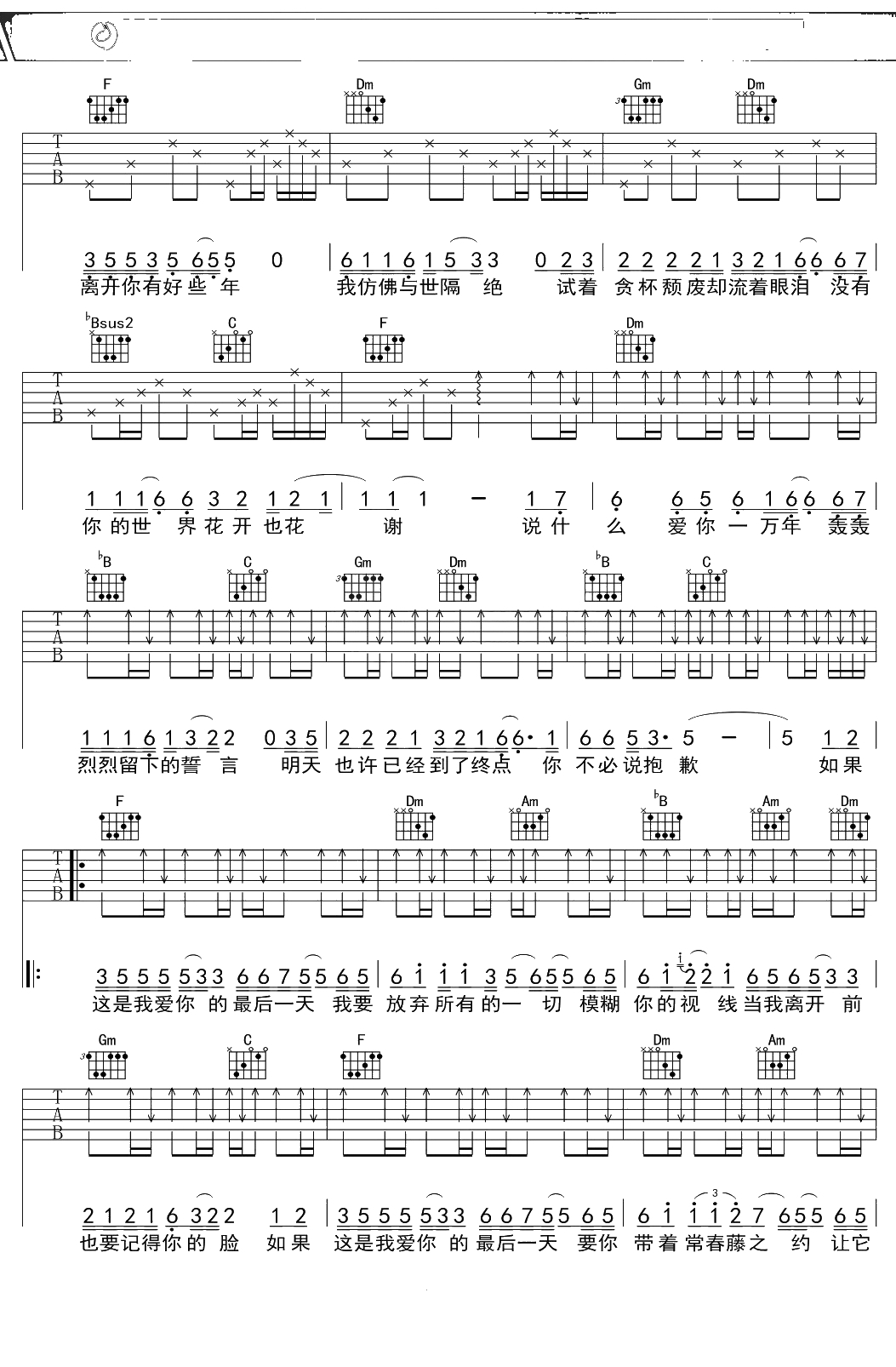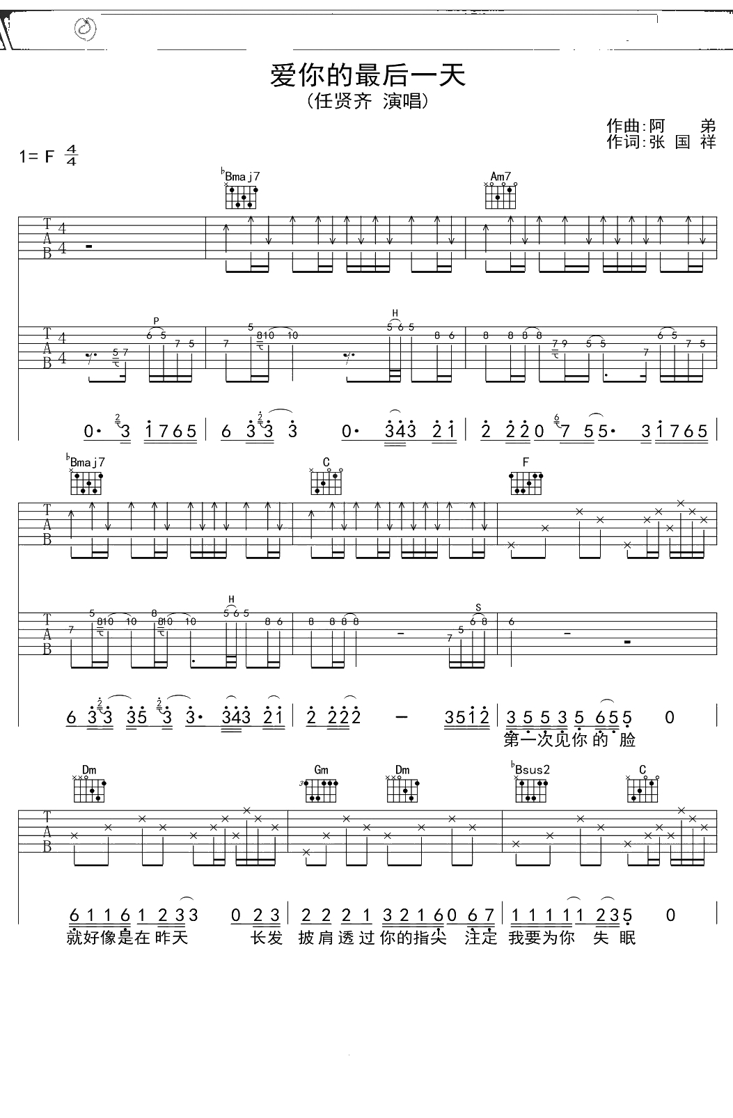 任贤齐《爱你的最后一天》吉他谱 F调弹唱六线谱