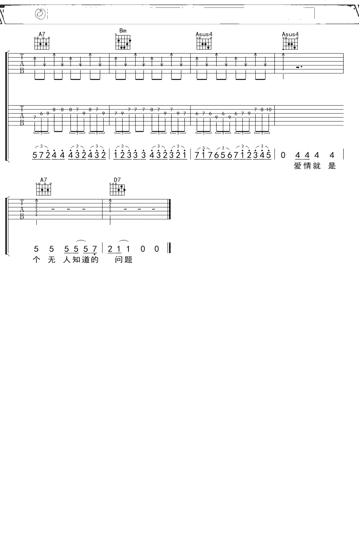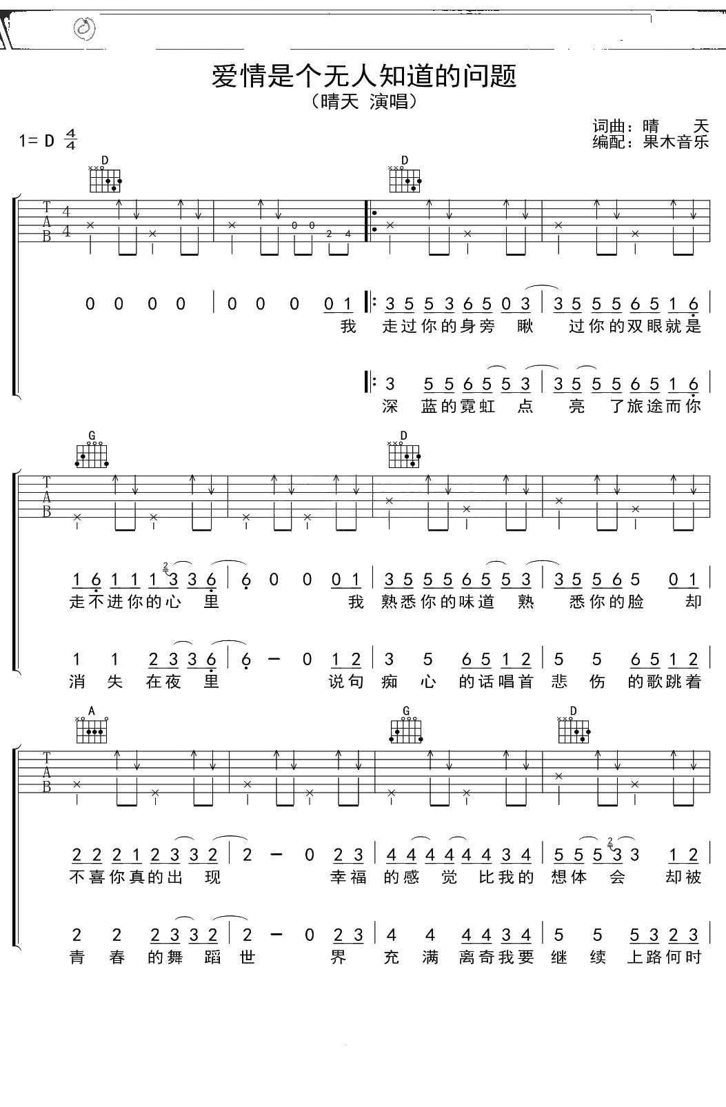 晴天《爱情是个无人知道的问题》吉他谱 D调弹唱六线谱吉他谱