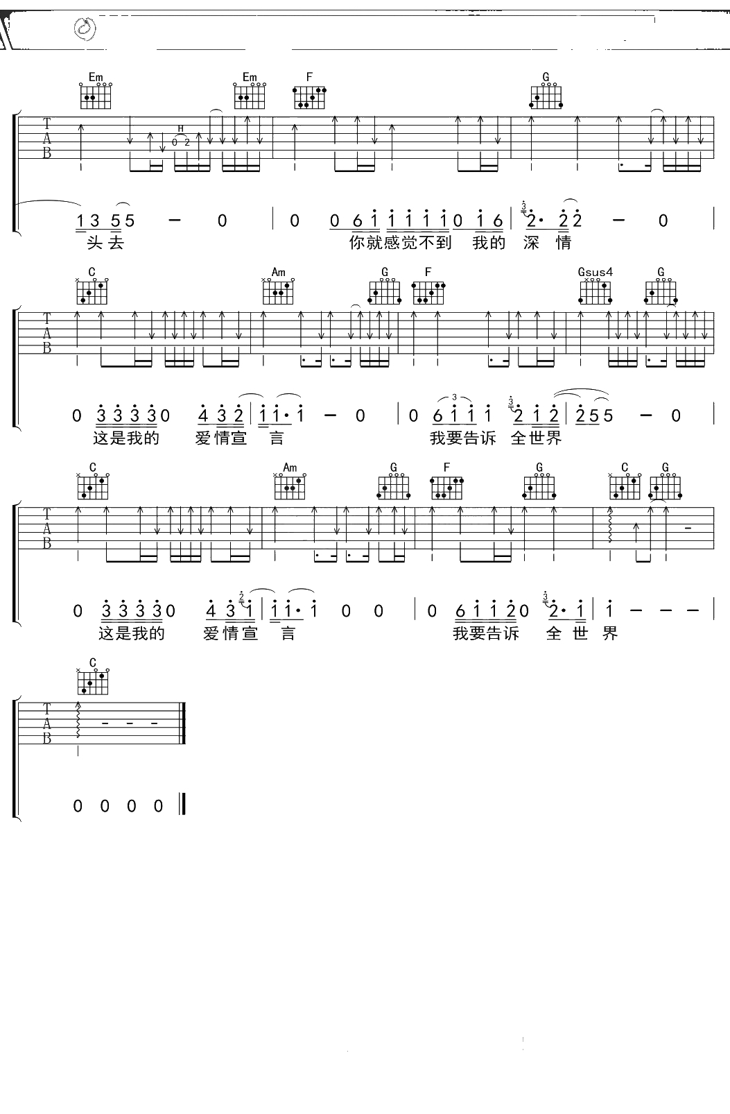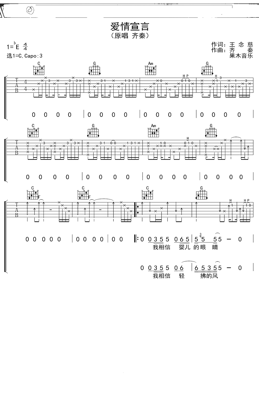 齐秦《爱情宣言》吉他谱 C调弹唱六线谱