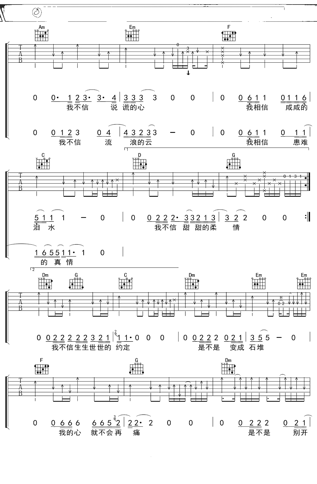 齐秦《爱情宣言》吉他谱 C调弹唱六线谱吉他谱