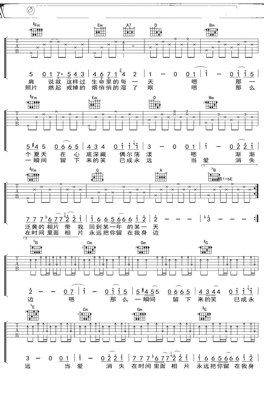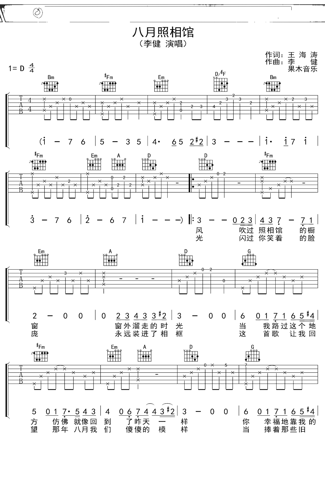 李健《八月的照相馆》吉他谱 D调弹唱六线谱吉他谱