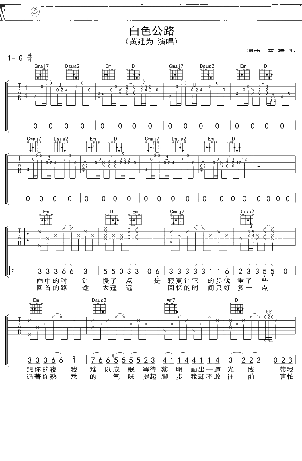 黄建为《白色公路》吉他谱 G调弹唱六线谱