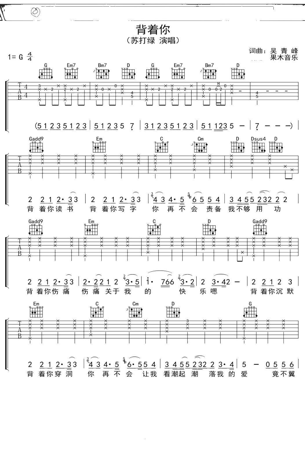 苏打绿《背着你》吉他谱 G调弹唱六线谱吉他谱