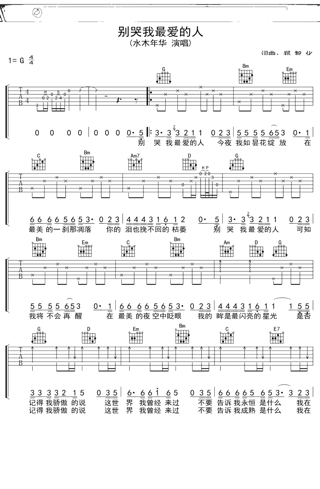 水木年华《别哭我最爱的人》吉他谱 G调弹唱六线谱