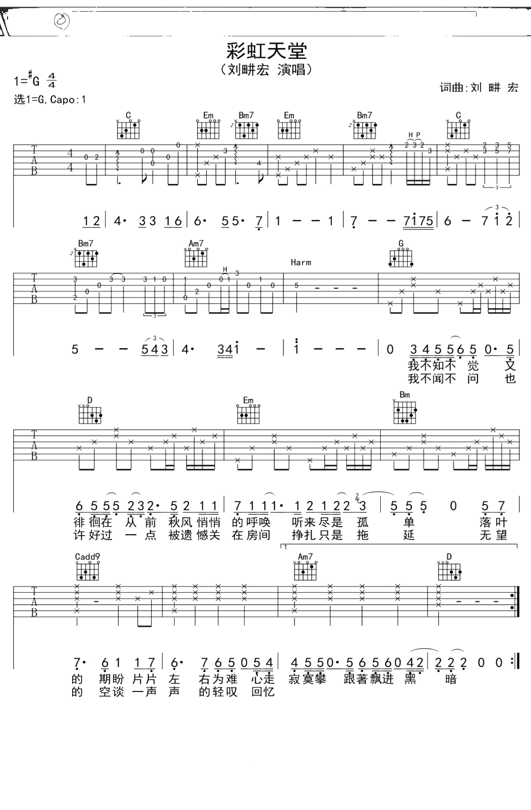 刘畊宏《彩虹天堂》吉他谱 G调弹唱六线谱