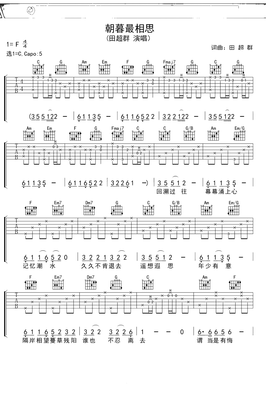 田超群《朝暮最相思》吉他谱 C调弹唱六线谱