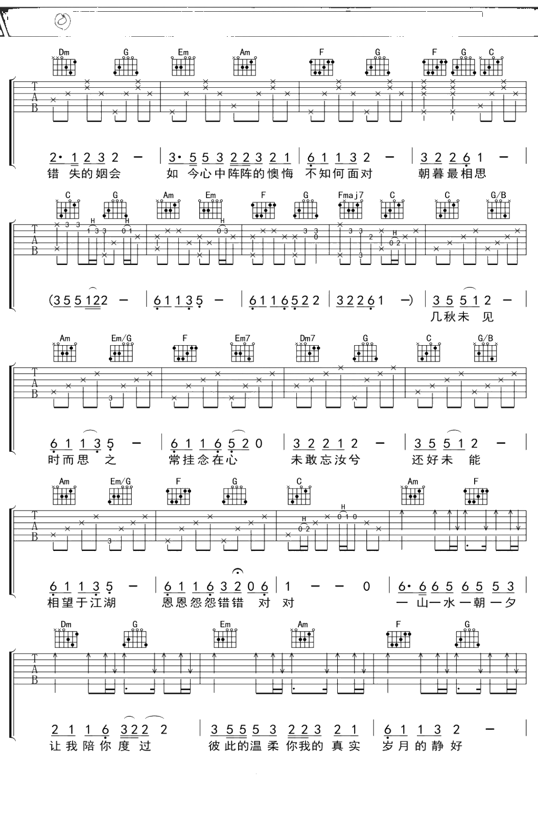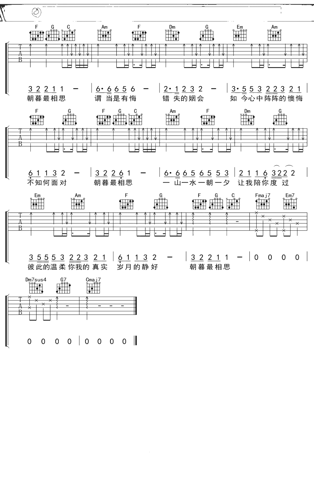 田超群《朝暮最相思》吉他谱 C调弹唱六线谱吉他谱