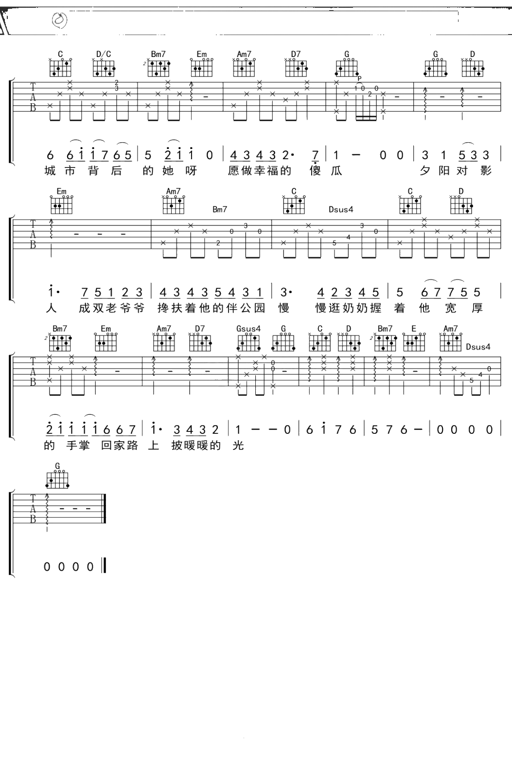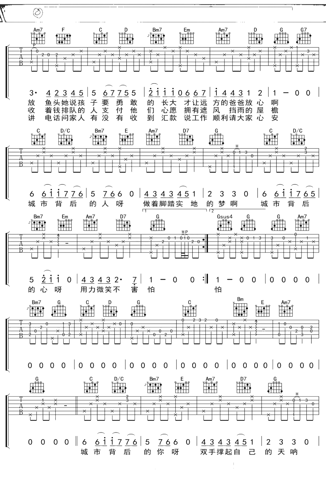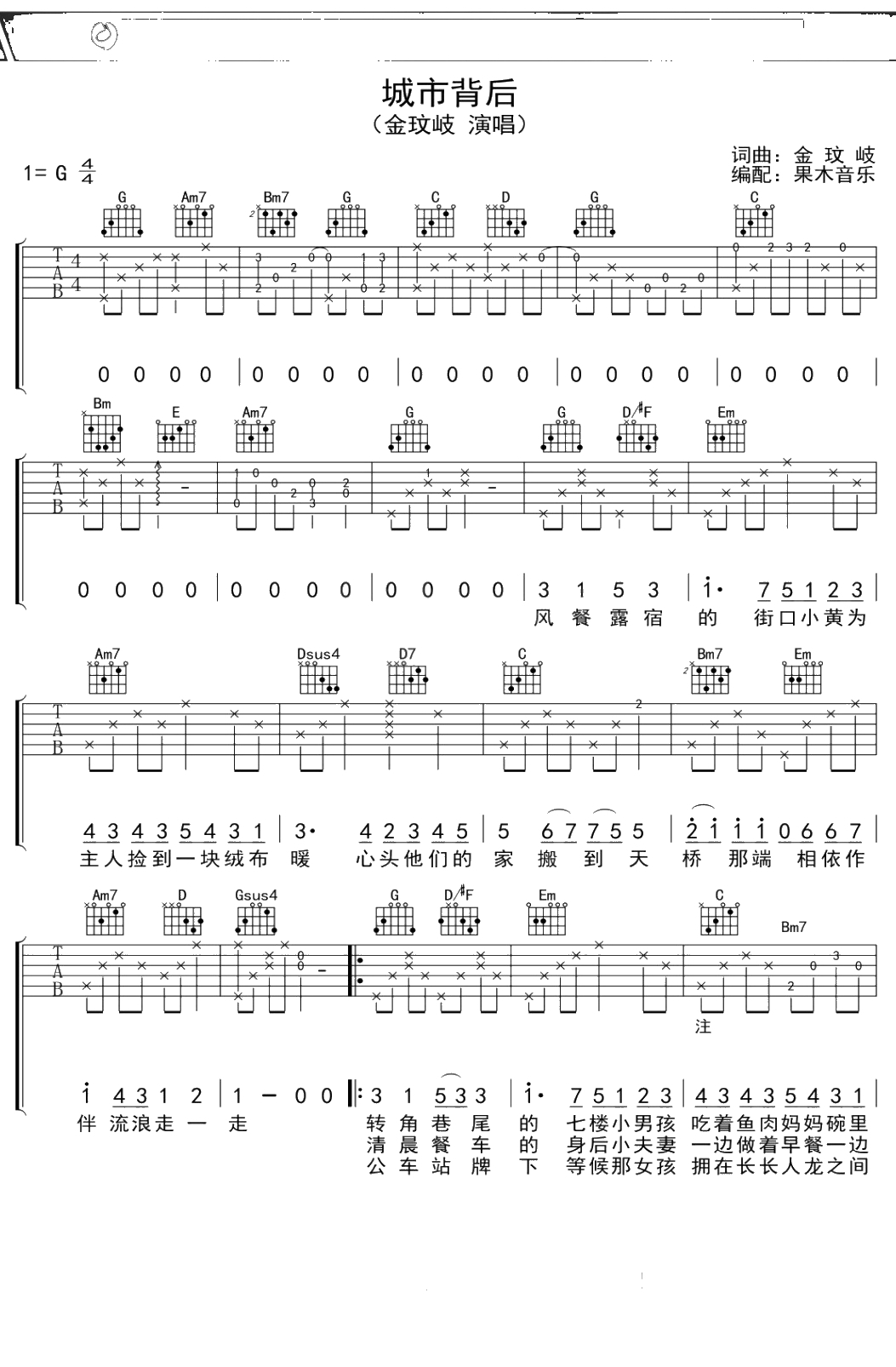 金玟岐《城市背后》吉他谱 G调弹唱六线谱