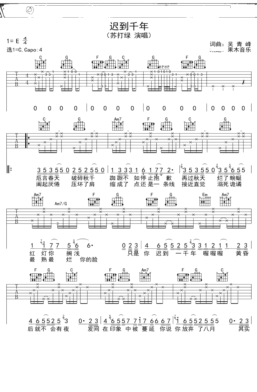 苏打绿《迟到千年》吉他谱 C调弹唱六线谱