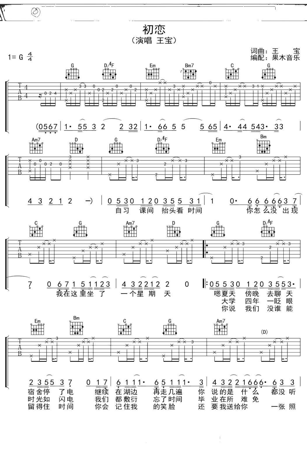 王宝《初恋》吉他谱 G调弹唱六线谱