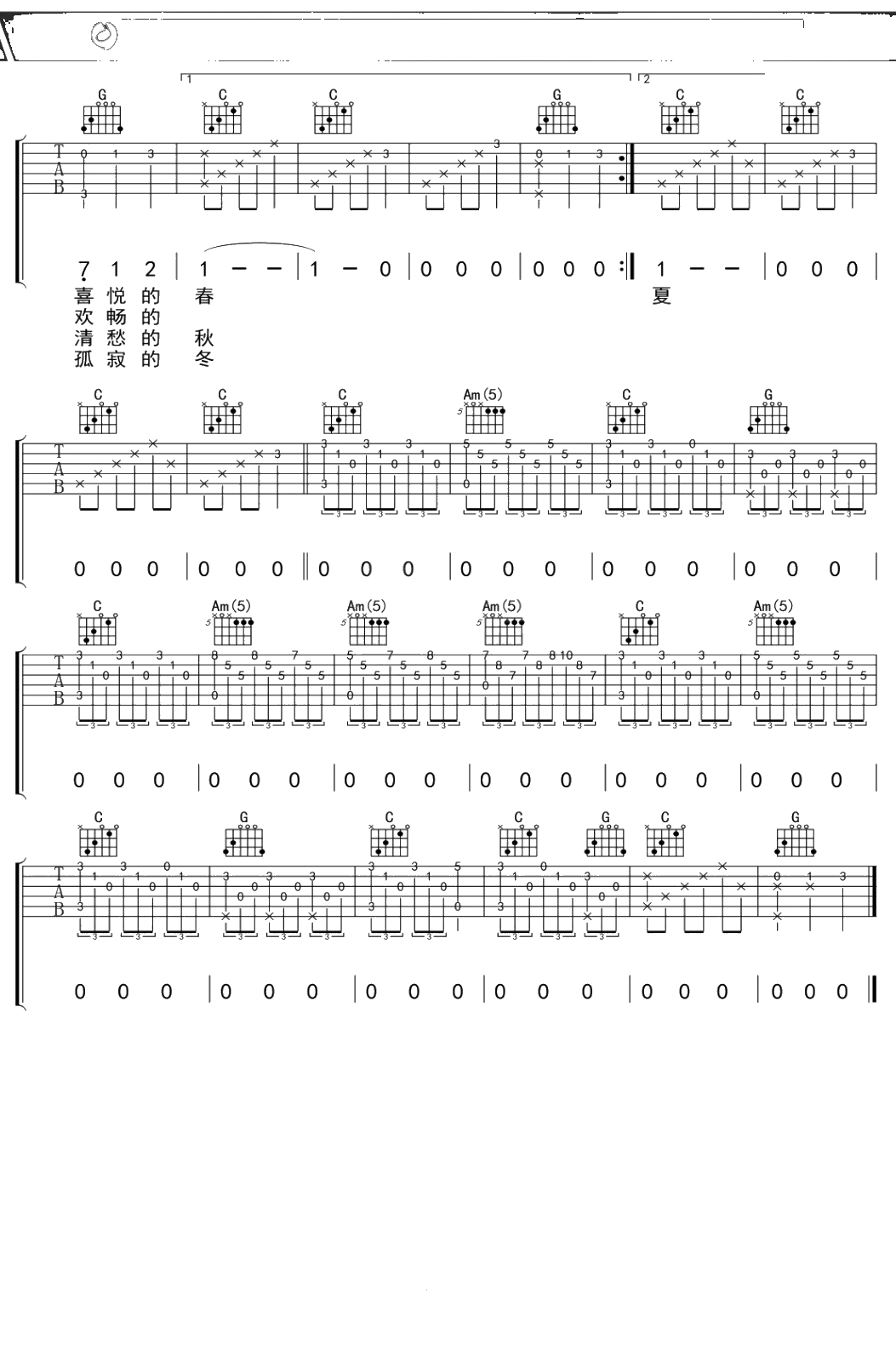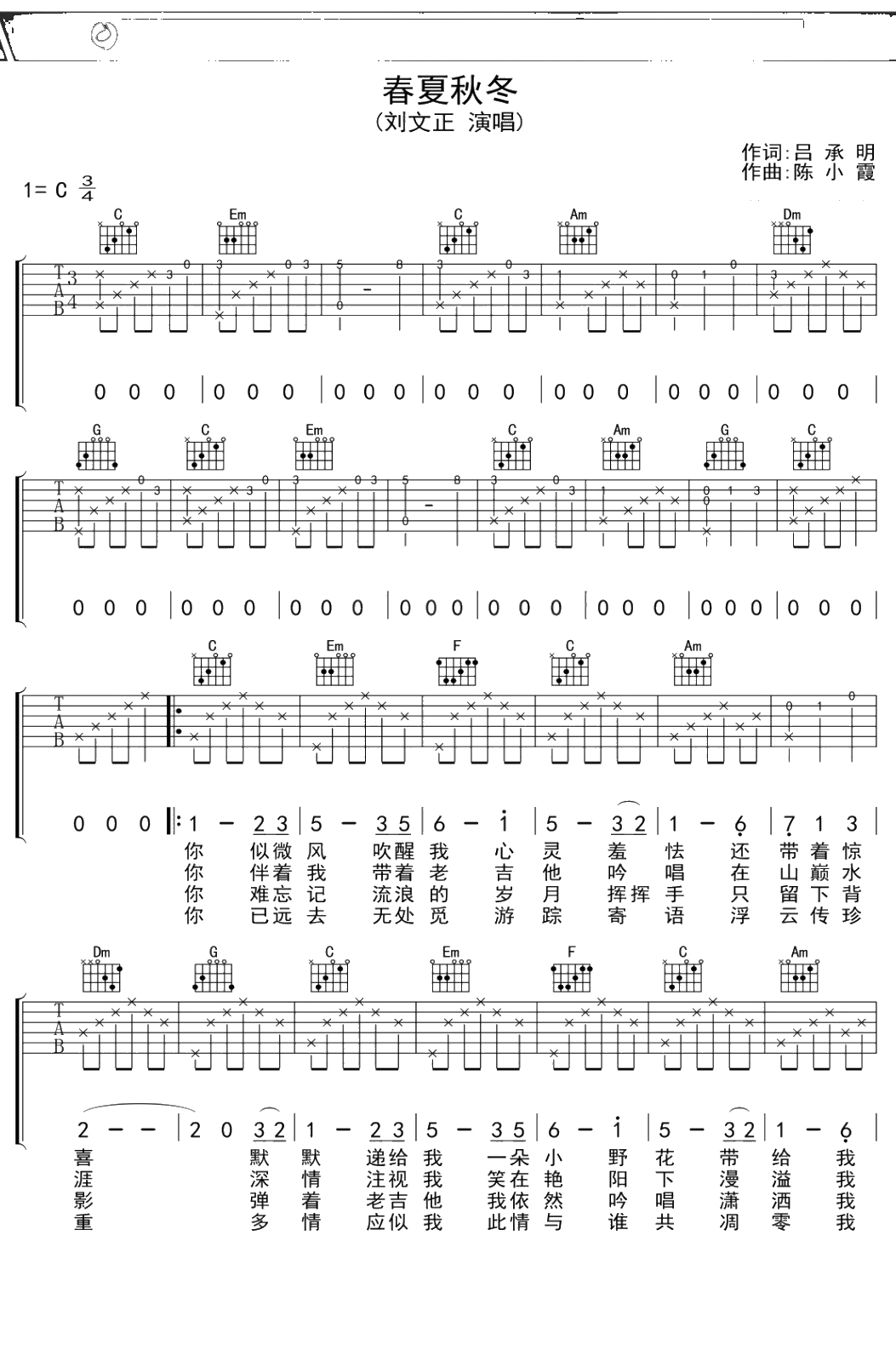 刘文正《春夏秋冬》吉他谱 C调弹唱六线谱