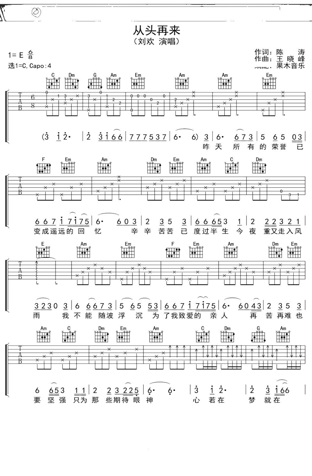 刘欢《从头再来》吉他谱 C调弹唱六线谱