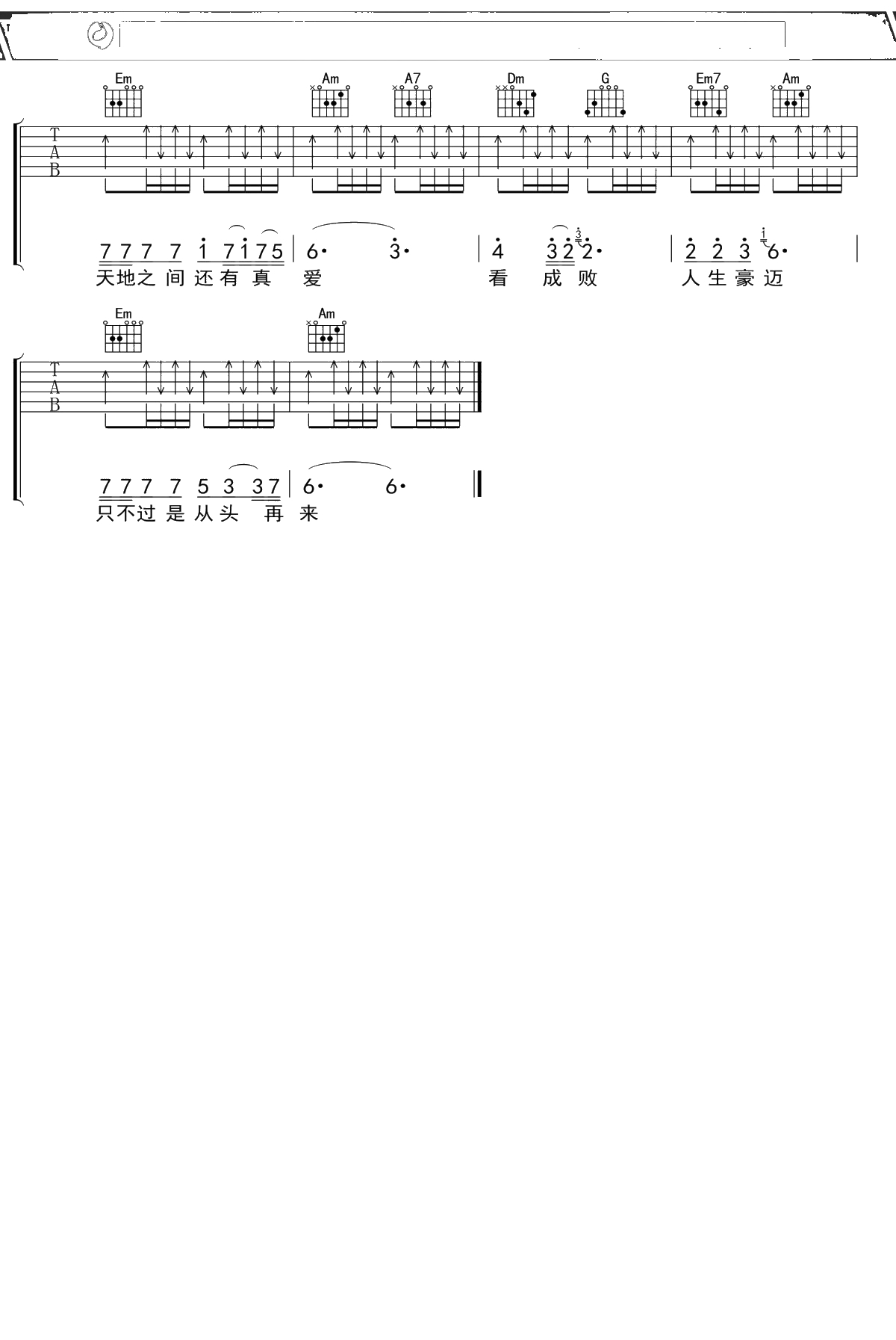 刘欢《从头再来》吉他谱 C调弹唱六线谱吉他谱