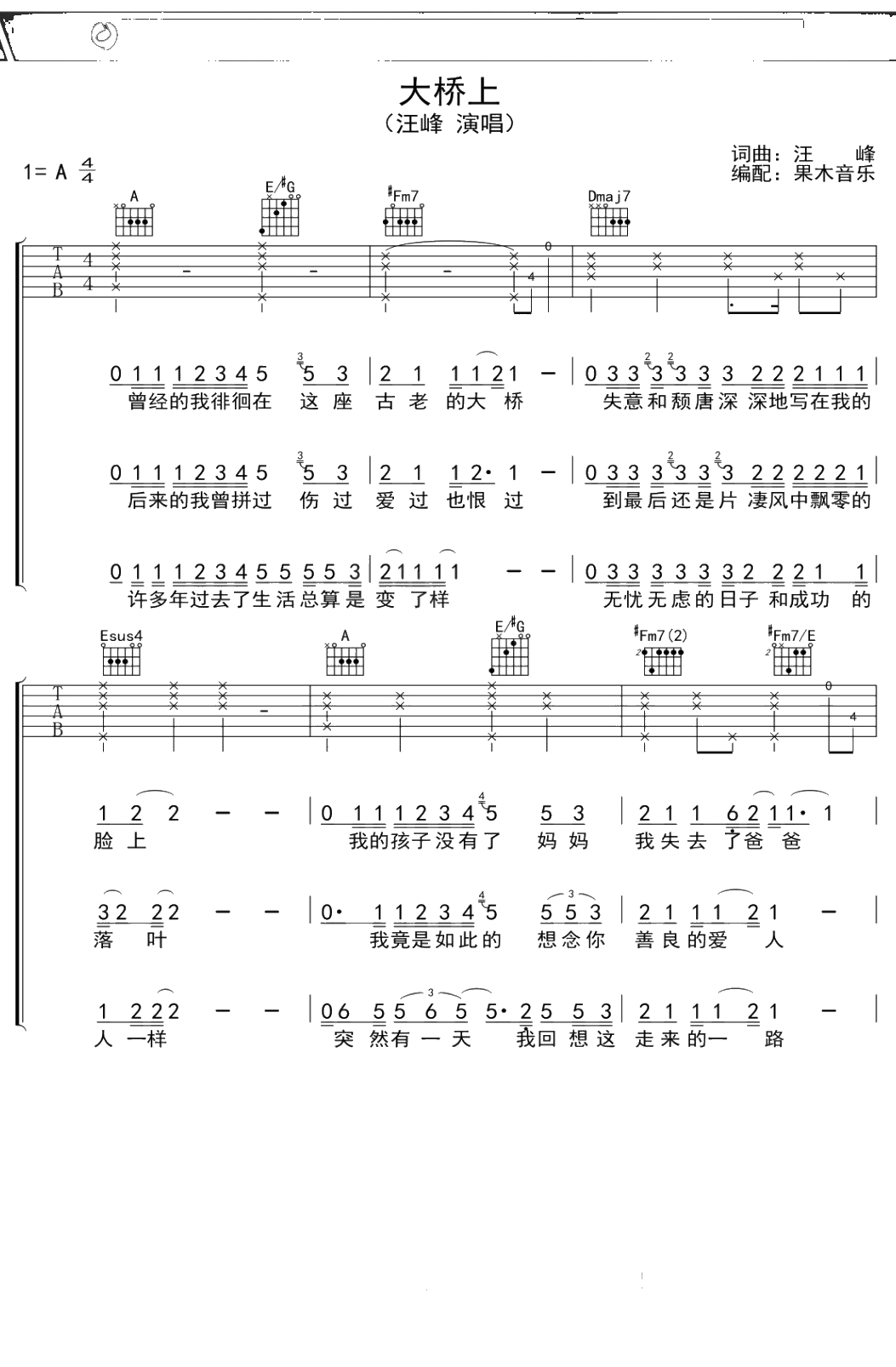 汪峰《大桥上》吉他谱 A调弹唱六线谱吉他谱
