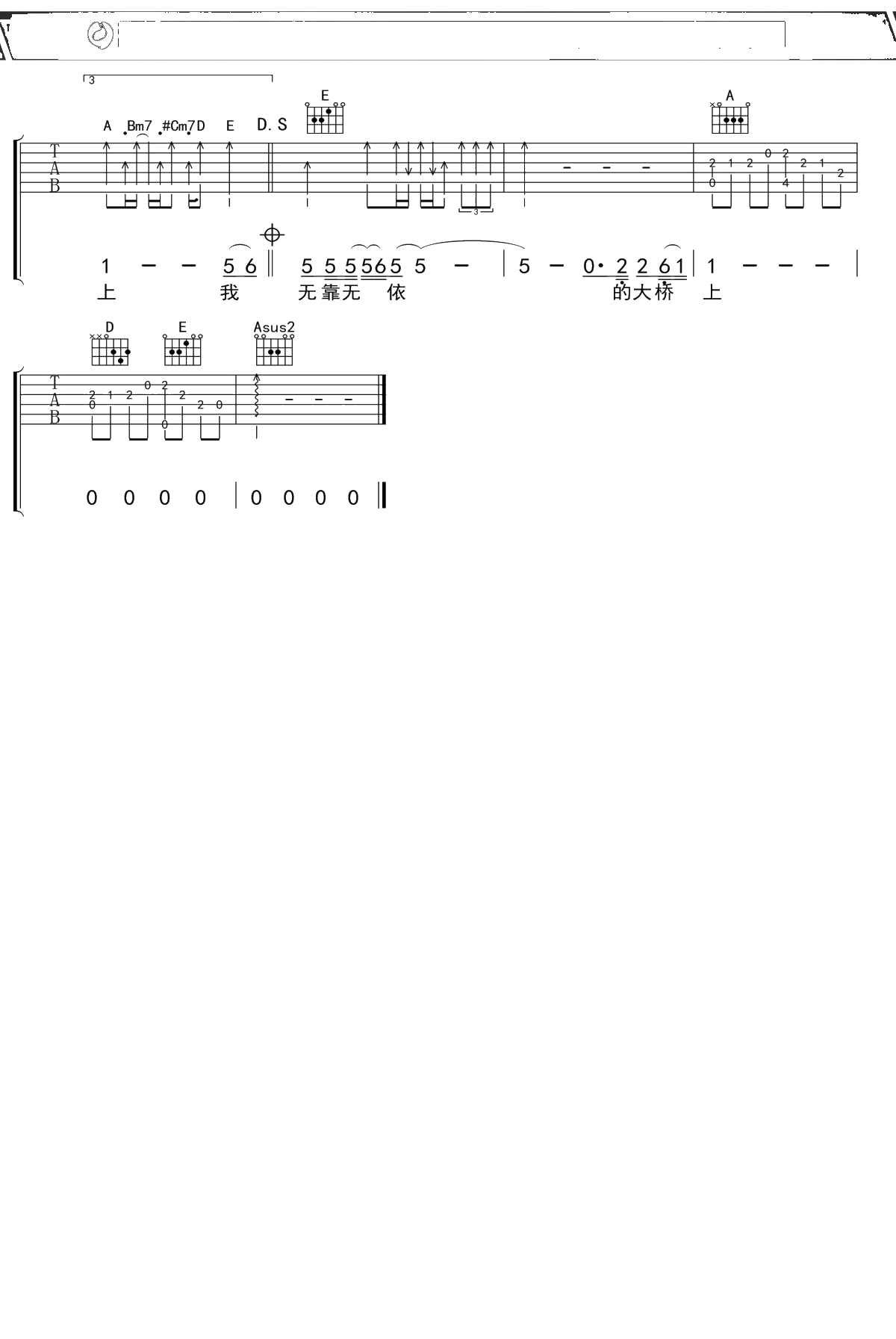 汪峰《大桥上》吉他谱 A调弹唱六线谱