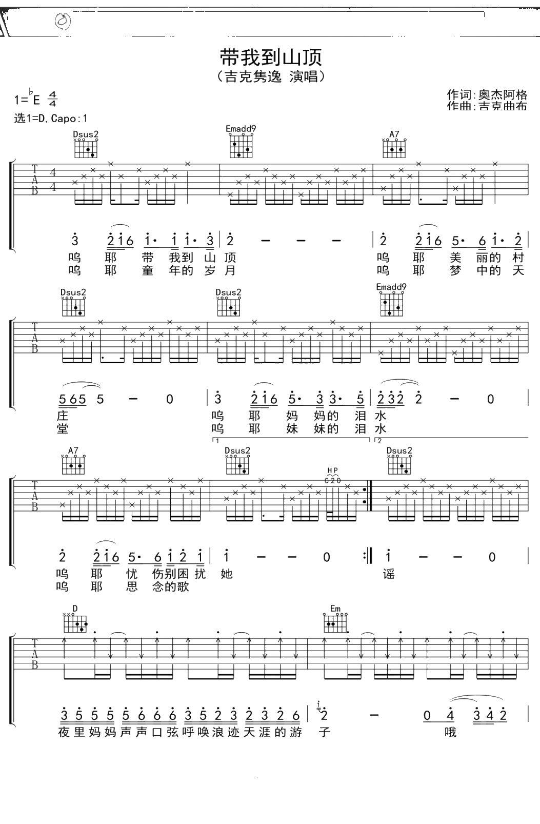吉克隽逸《带我到山顶》吉他谱 D调弹唱六线谱吉他谱