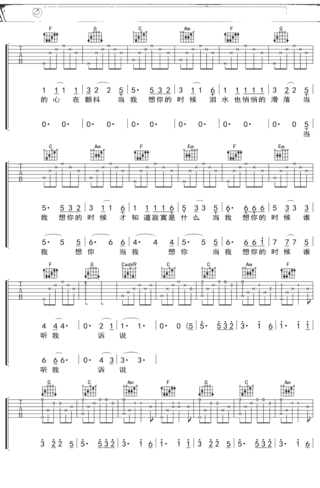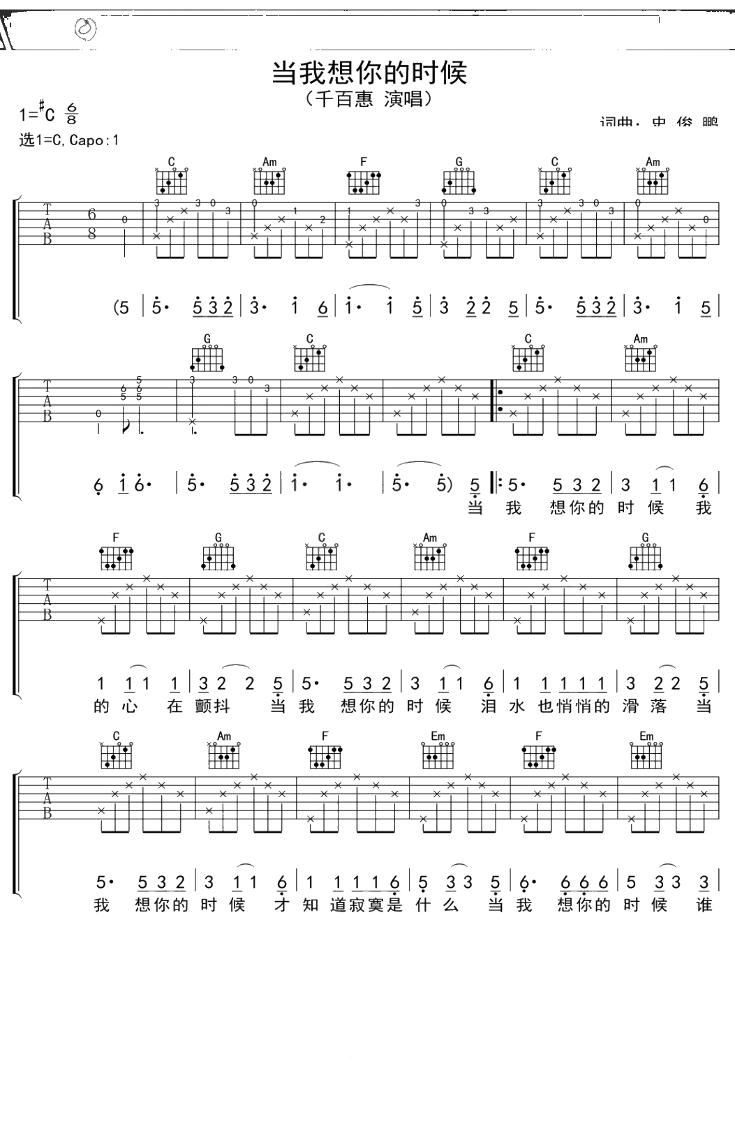 千百惠《当我想你的时候》吉他谱 C调弹唱六线谱