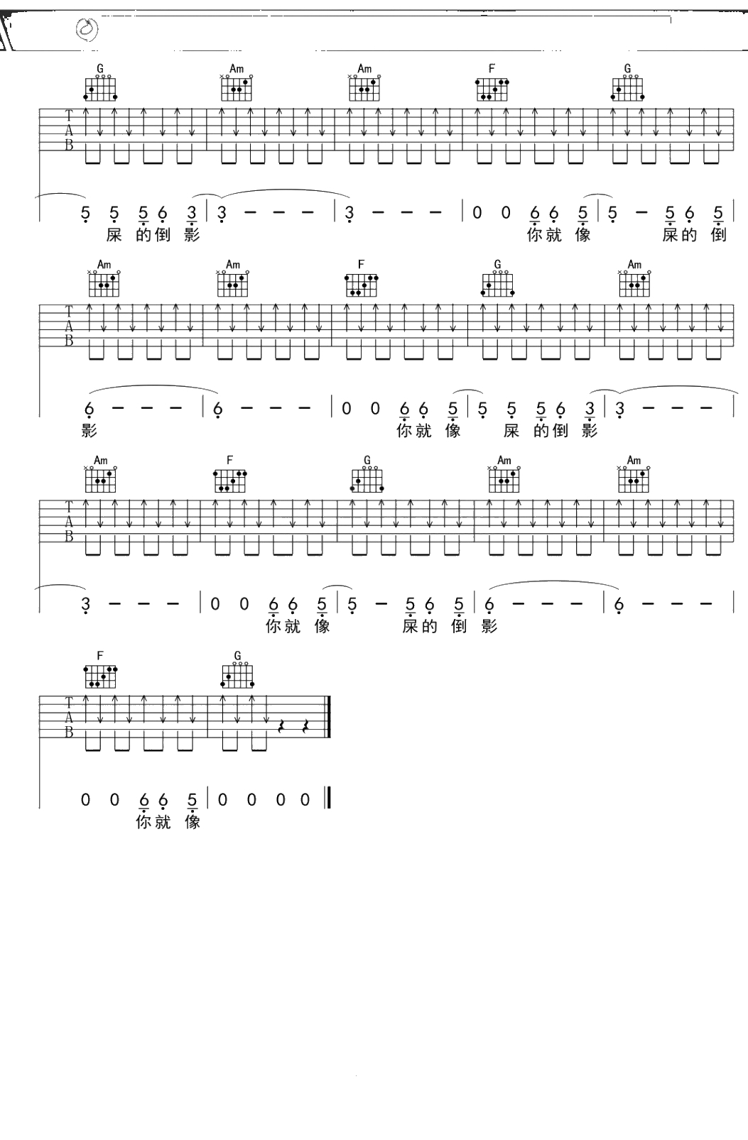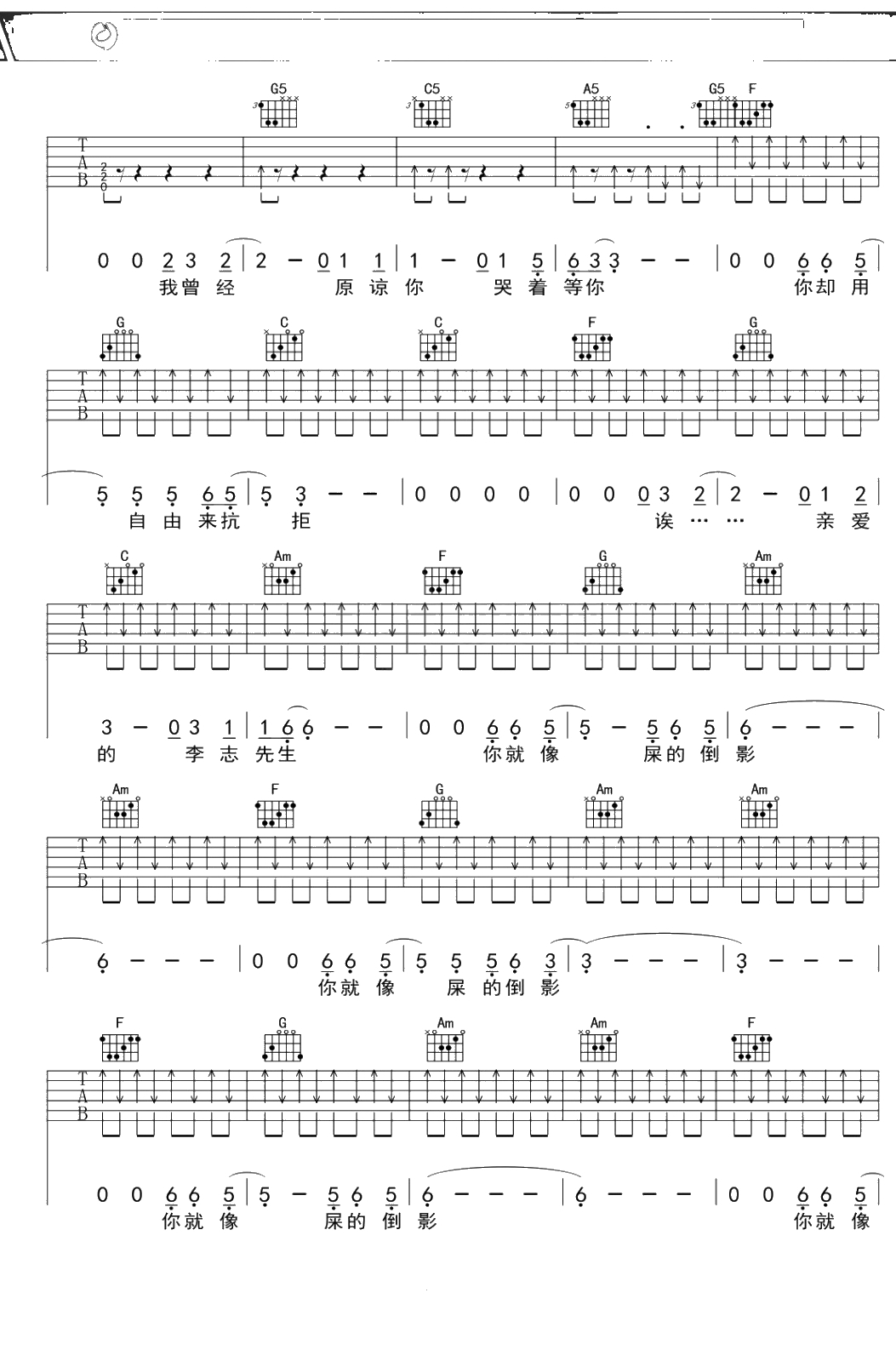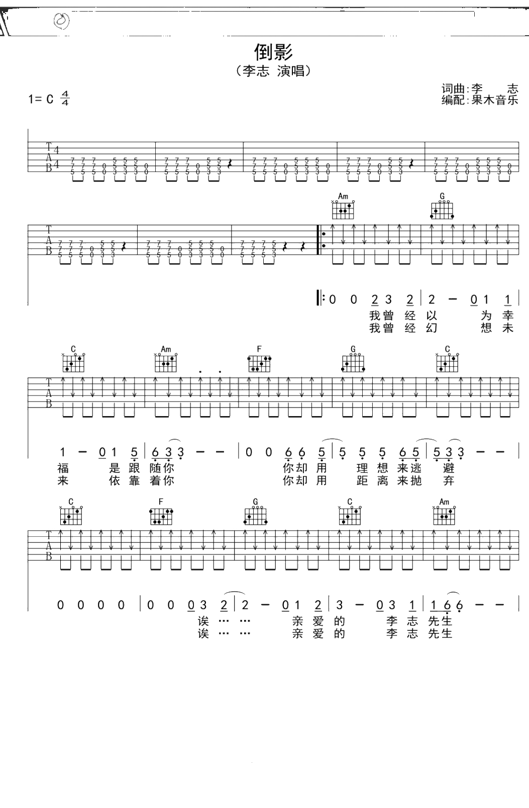 李志《倒影》吉他谱 C调弹唱六线谱