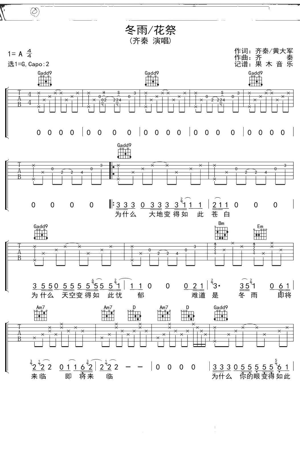 齐秦《冬雨花祭》吉他谱 G调弹唱六线谱吉他谱