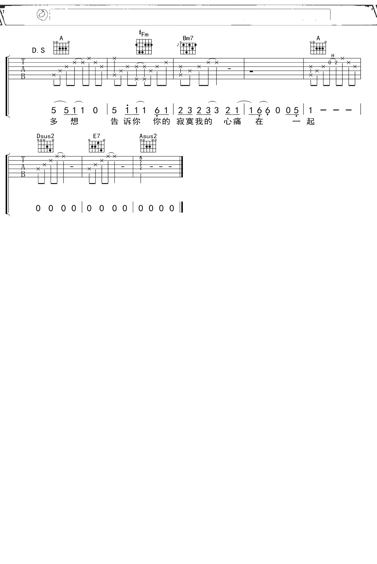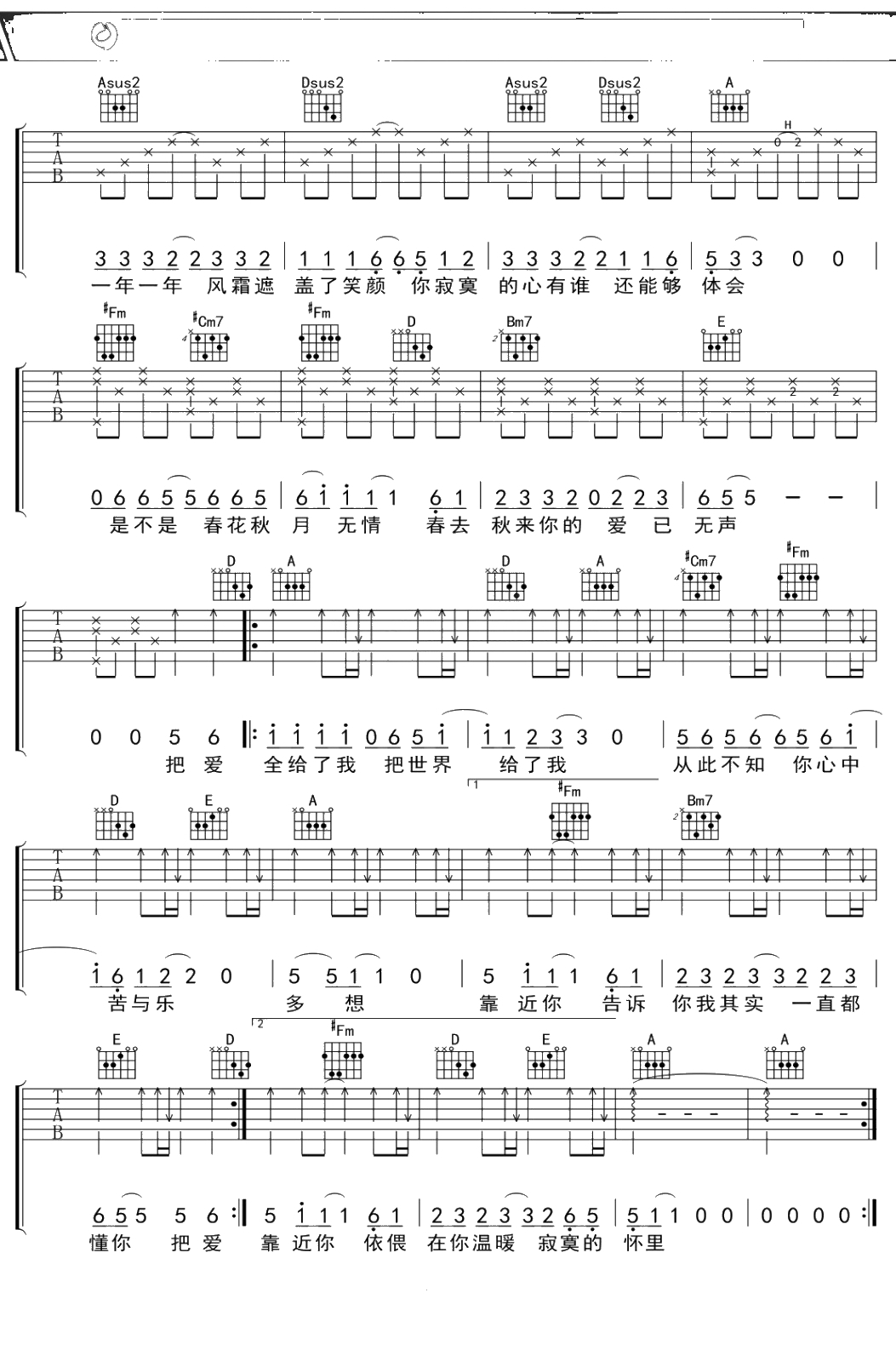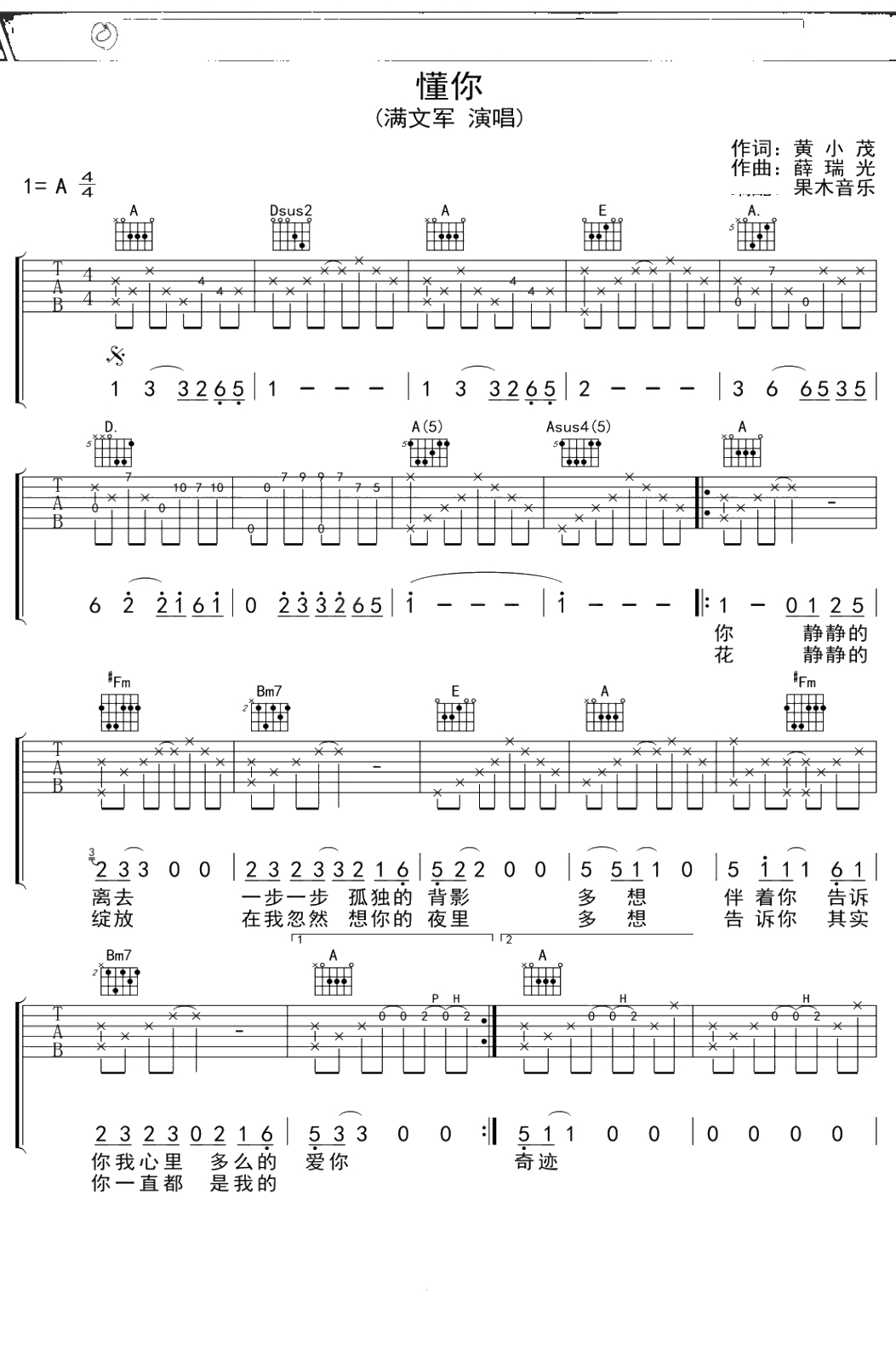 满文军《懂你》吉他谱 A调弹唱六线谱