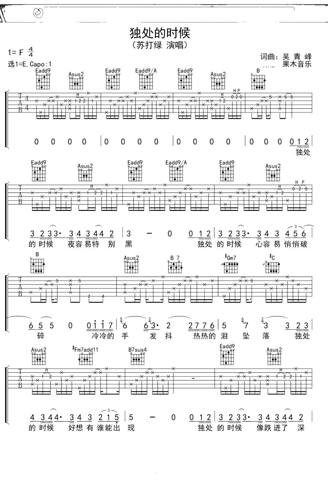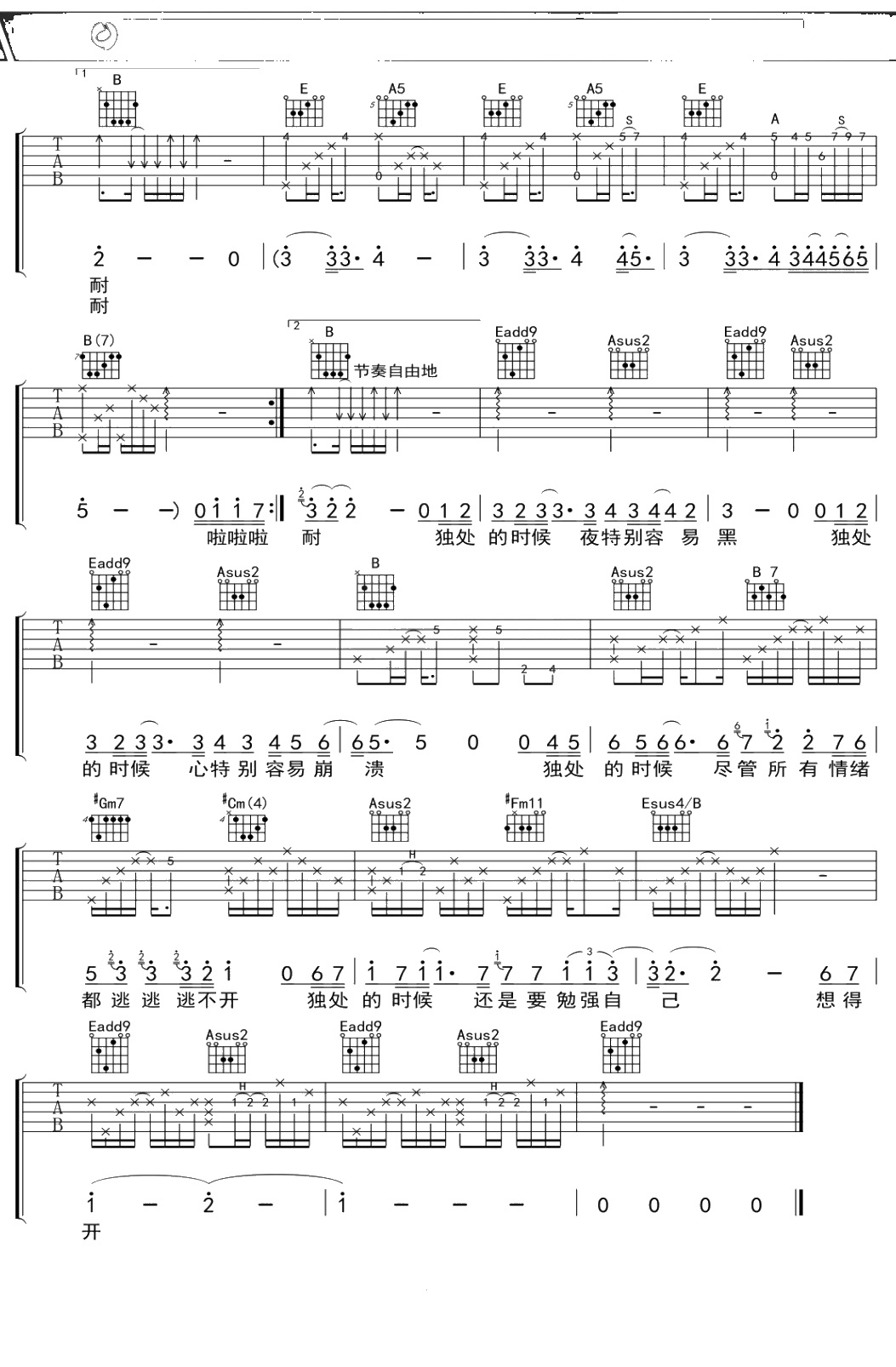 苏打绿《独处的时候》吉他谱 E调弹唱六线谱
