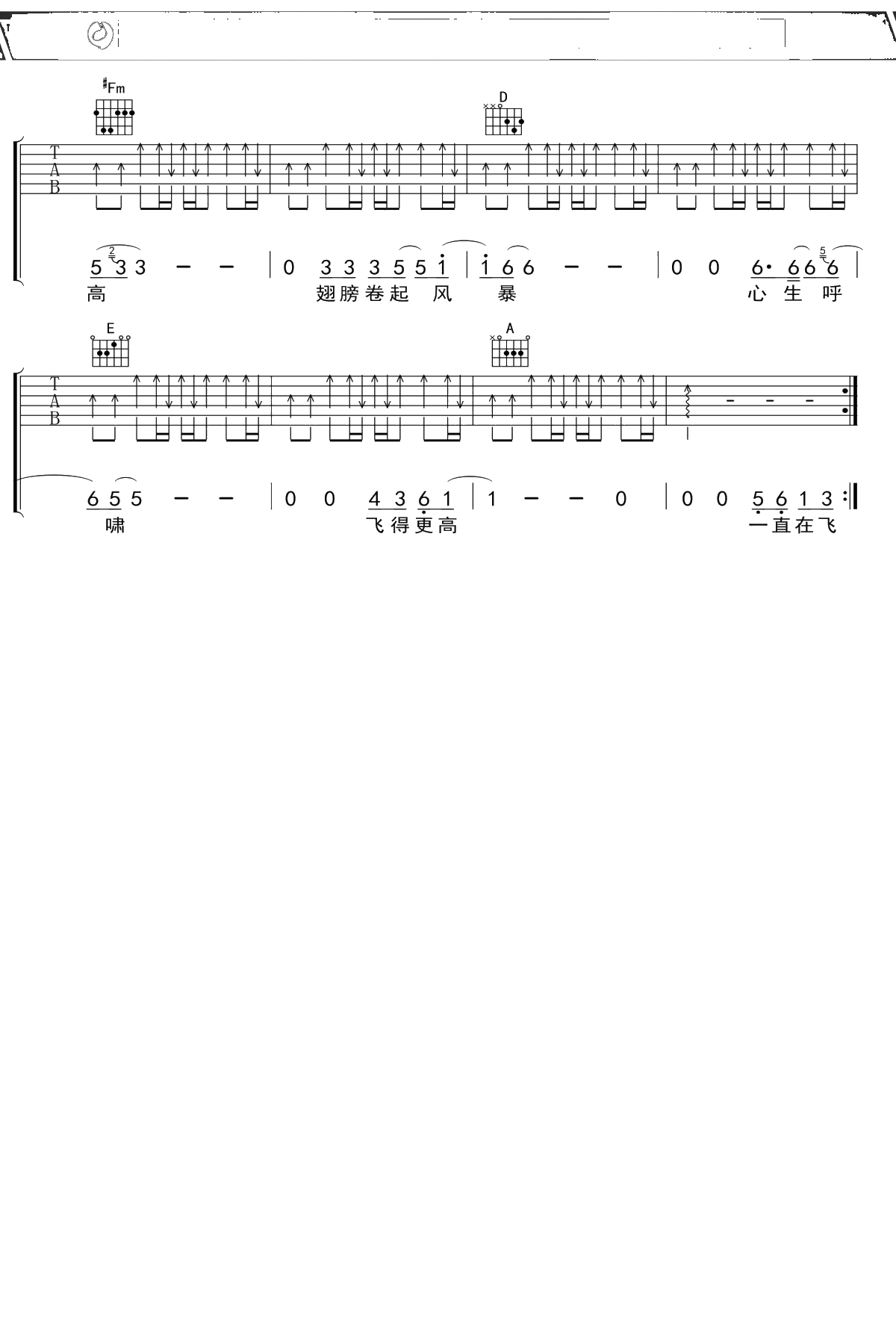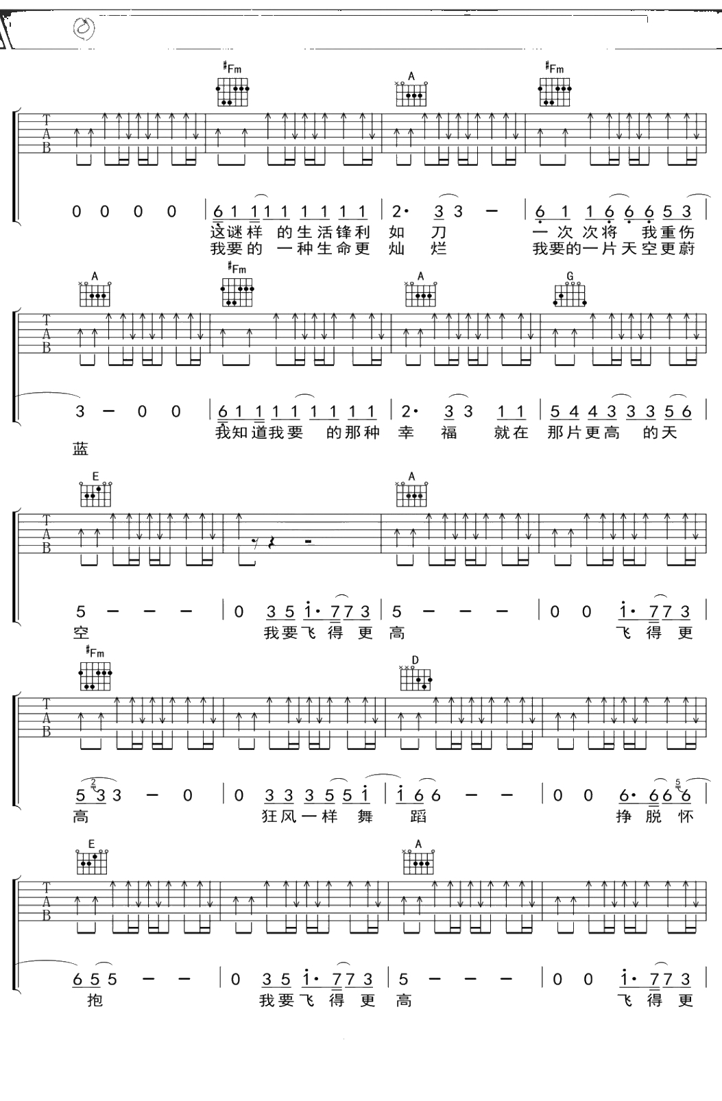 汪峰《飞得更高》吉他谱 A调弹唱六线谱