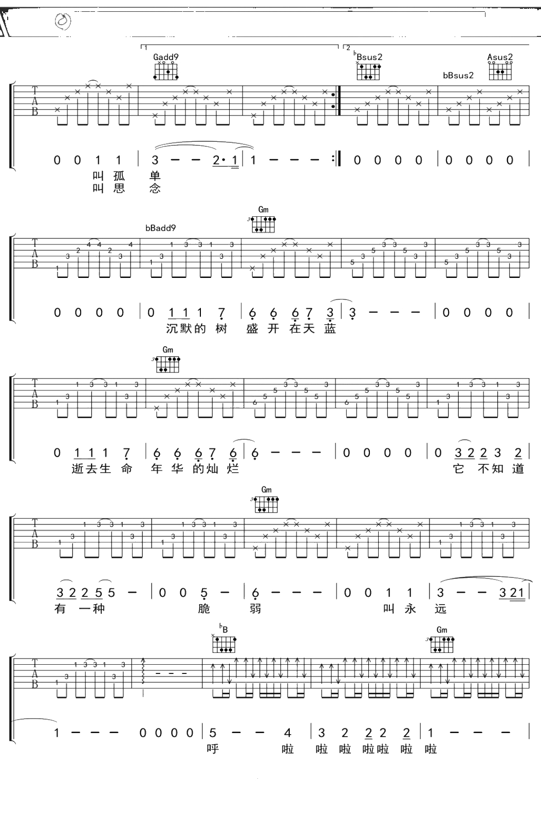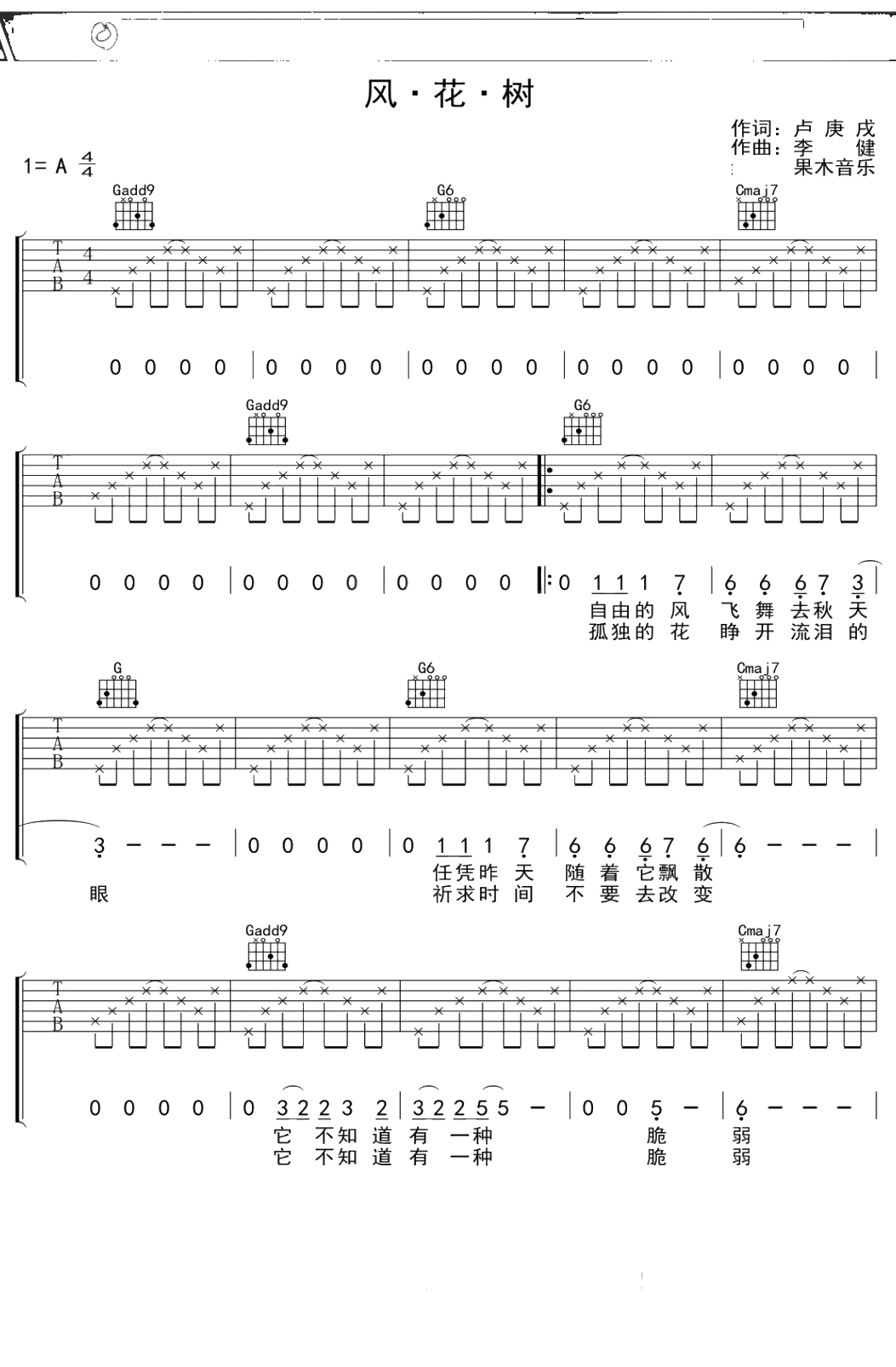 水木年华《风花树》吉他谱 A调弹唱六线谱