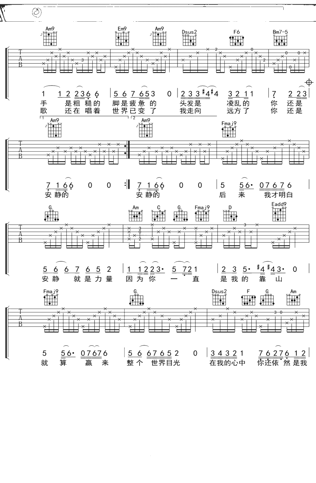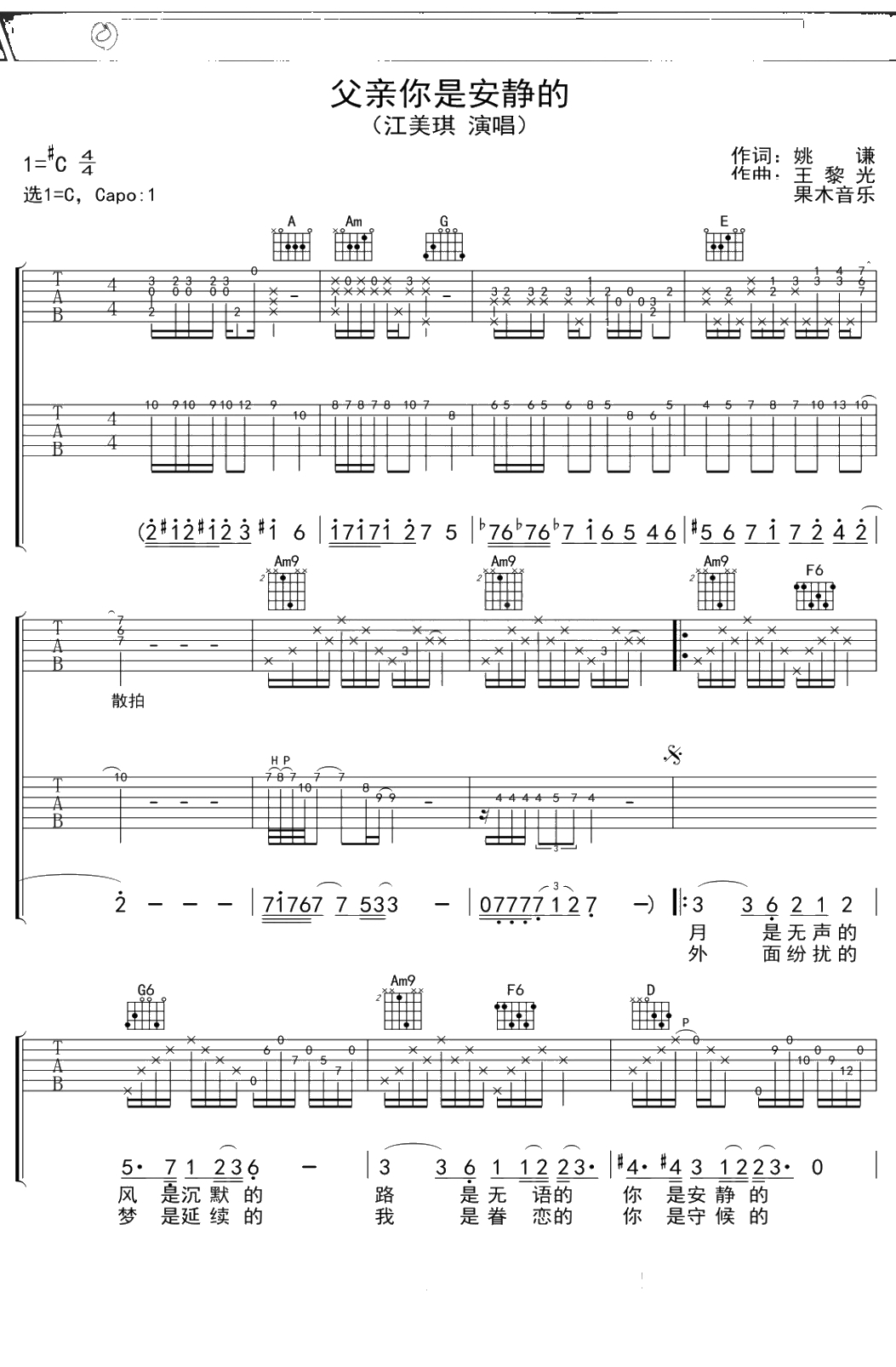 江美琪《父亲你是安静的》吉他谱 C调弹唱六线谱