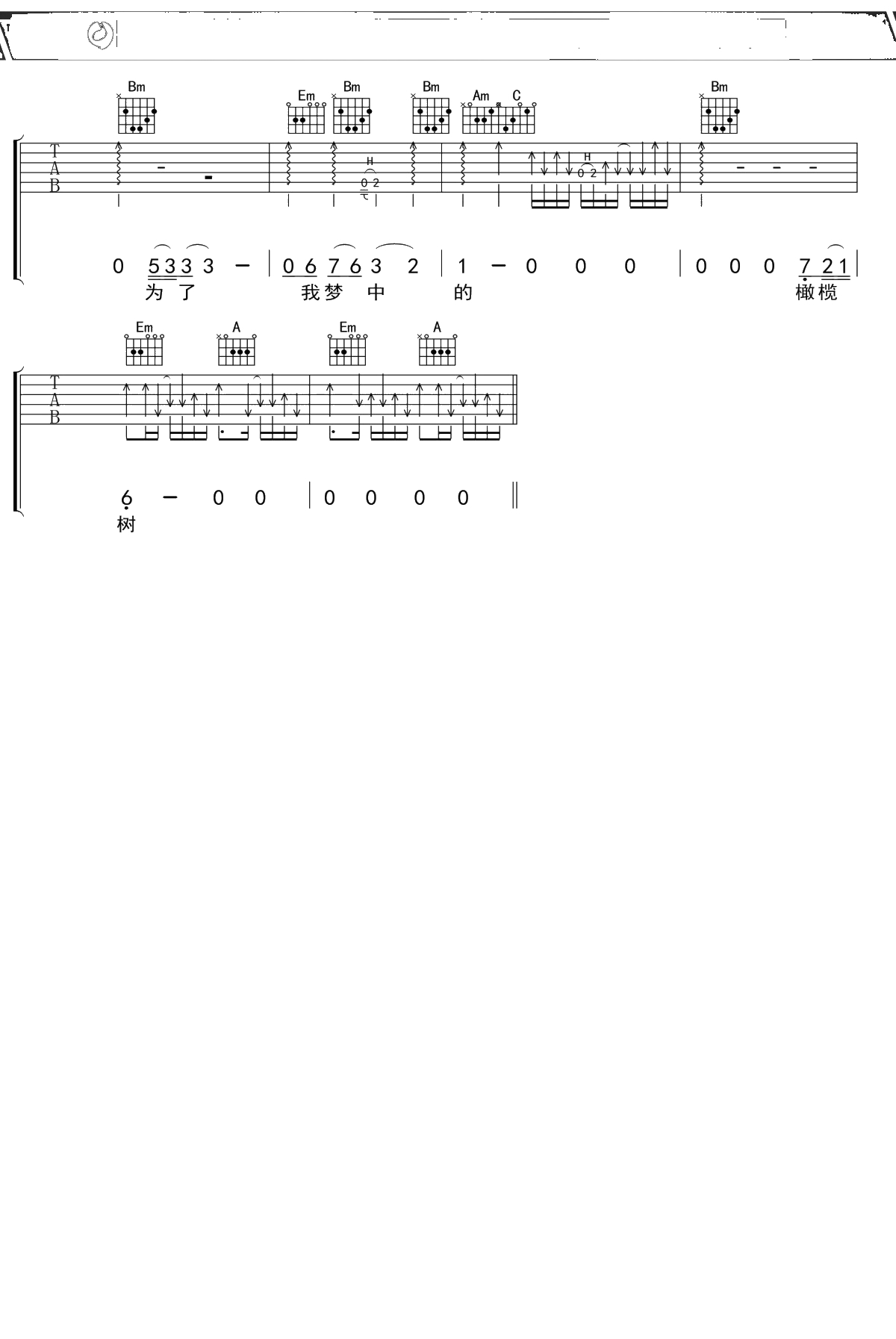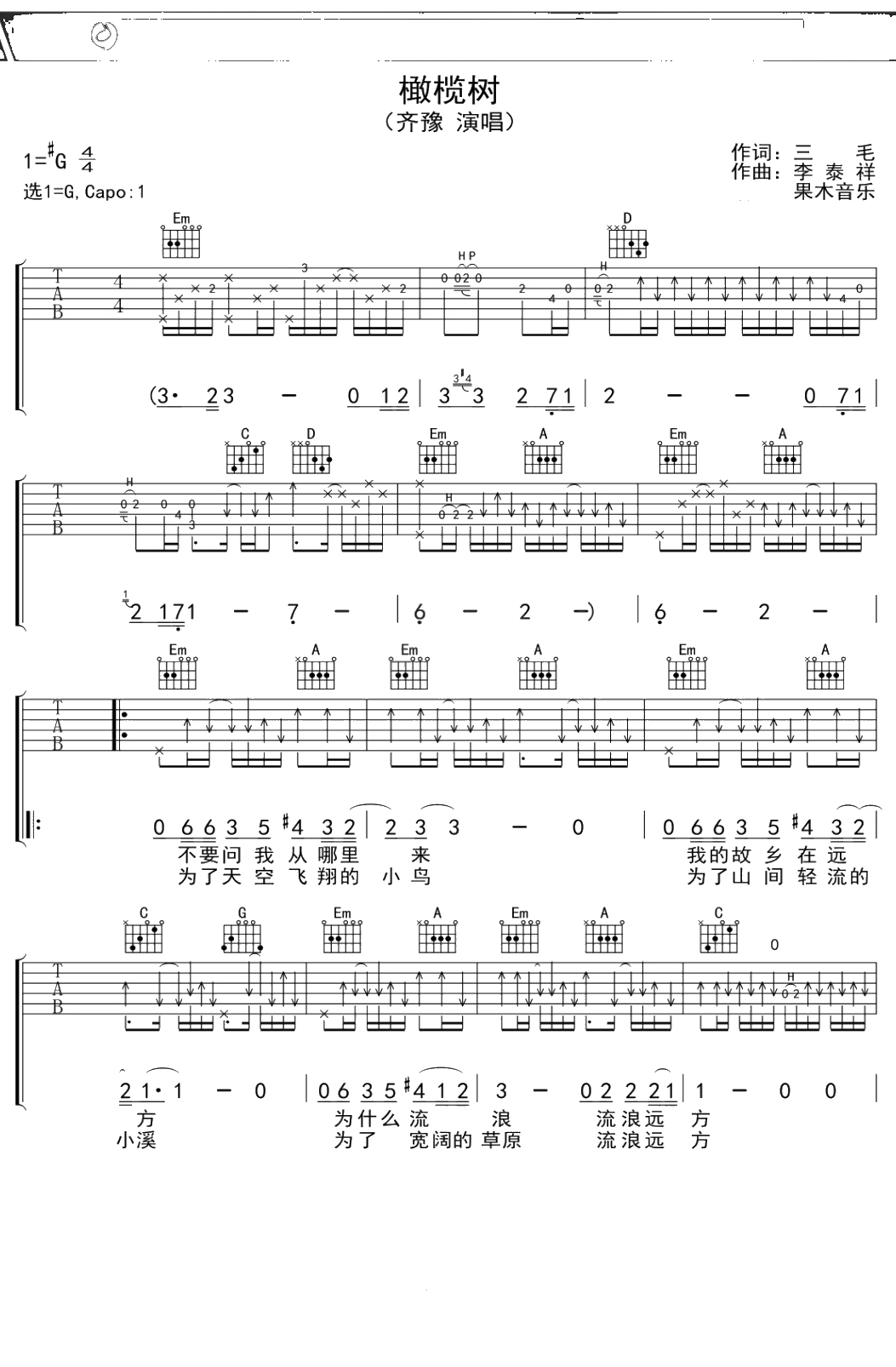 齐豫《橄榄树》吉他谱 G调弹唱六线谱吉他谱