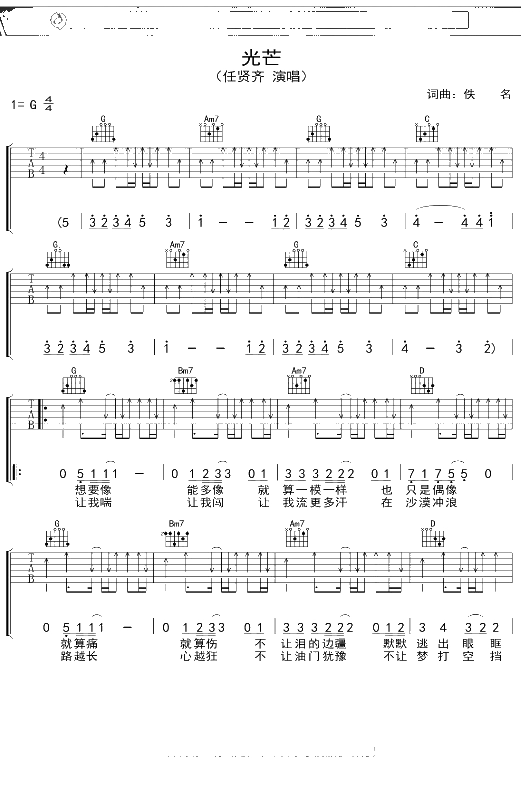 任贤齐《光芒》吉他谱 G调弹唱六线谱吉他谱
