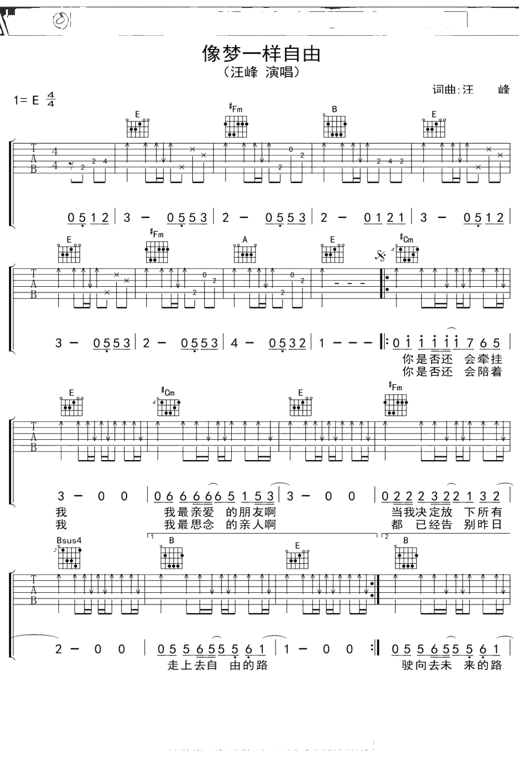 汪峰《像梦一样自由》吉他谱 E调弹唱六线谱吉他谱