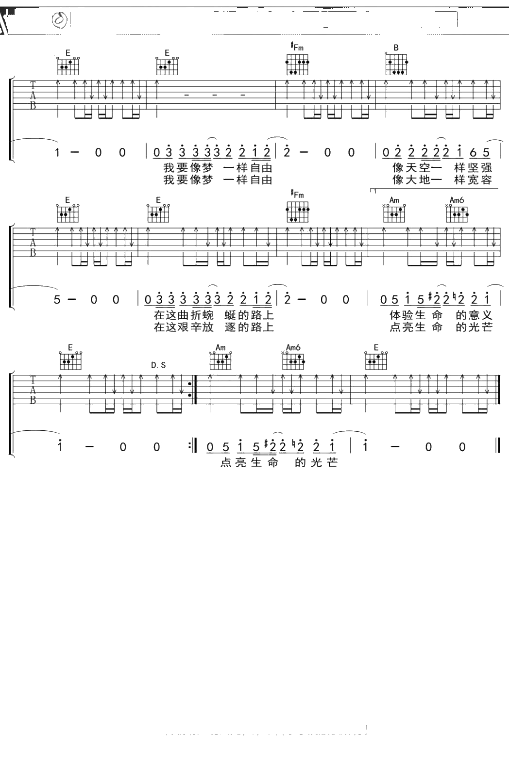 汪峰《像梦一样自由》吉他谱 E调弹唱六线谱