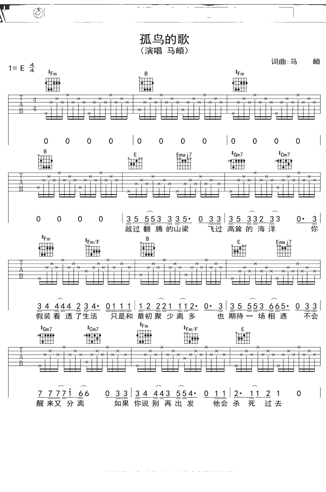 马頔《孤鸟的歌》吉他谱 E调弹唱六线谱