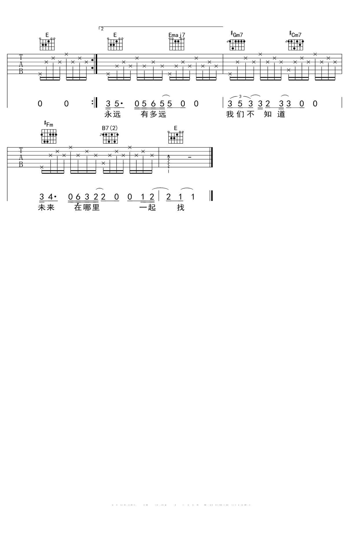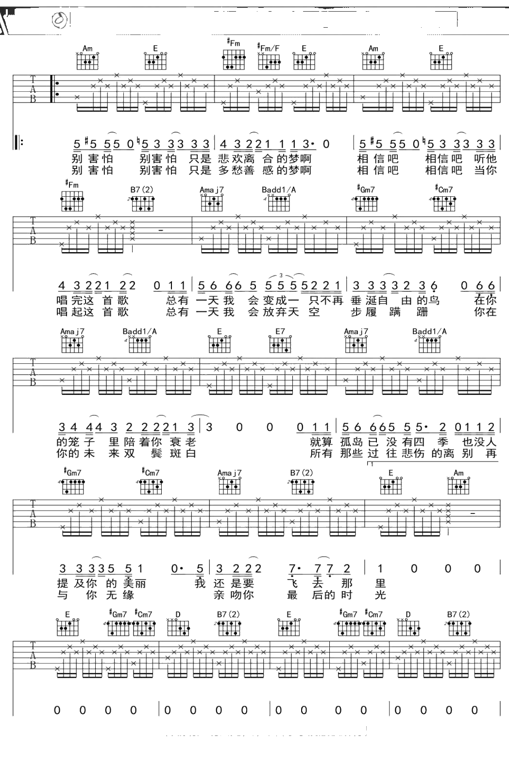 马頔《孤鸟的歌》吉他谱 E调弹唱六线谱吉他谱
