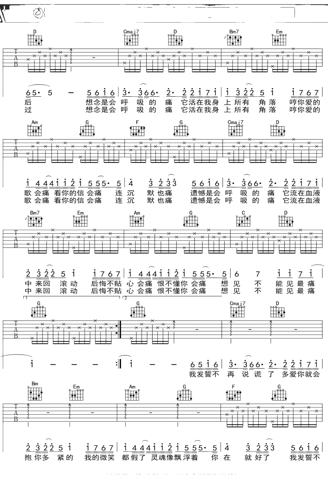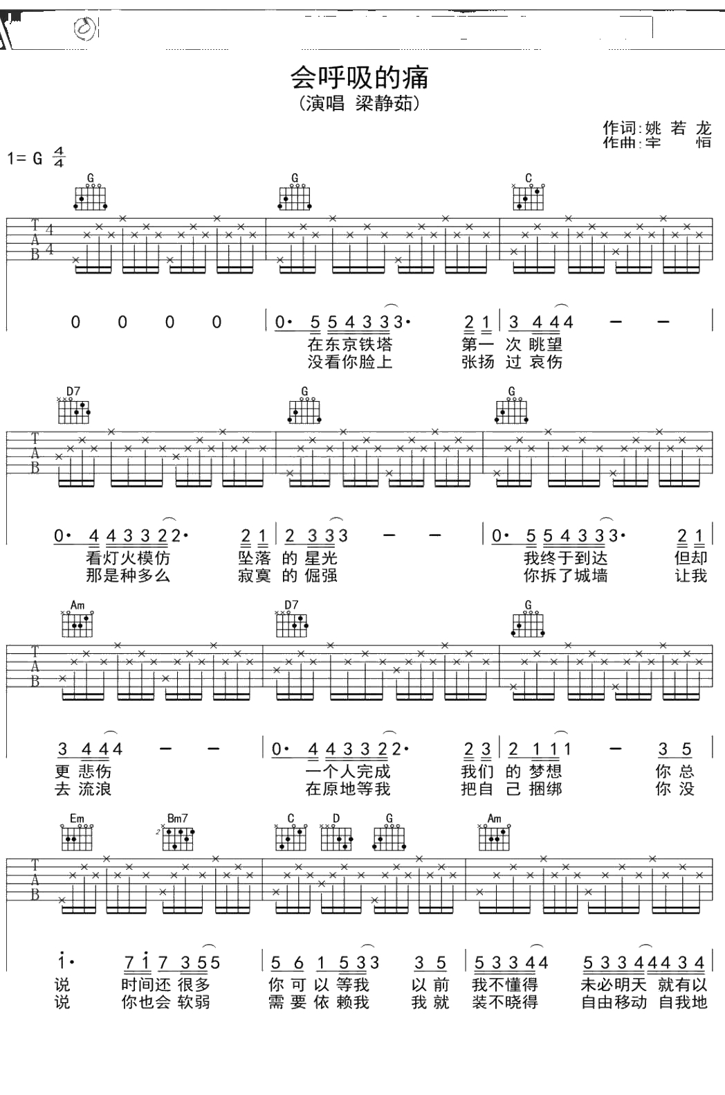 梁静茹《会呼吸的痛》吉他谱 G调弹唱六线谱