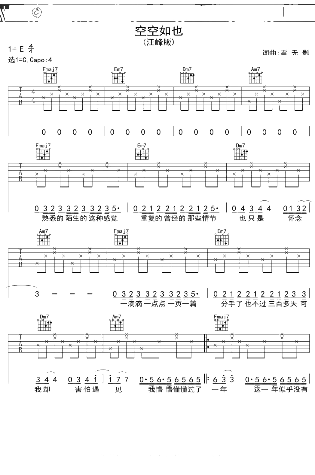 汪峰《空空如也》吉他谱 C调弹唱六线谱吉他谱