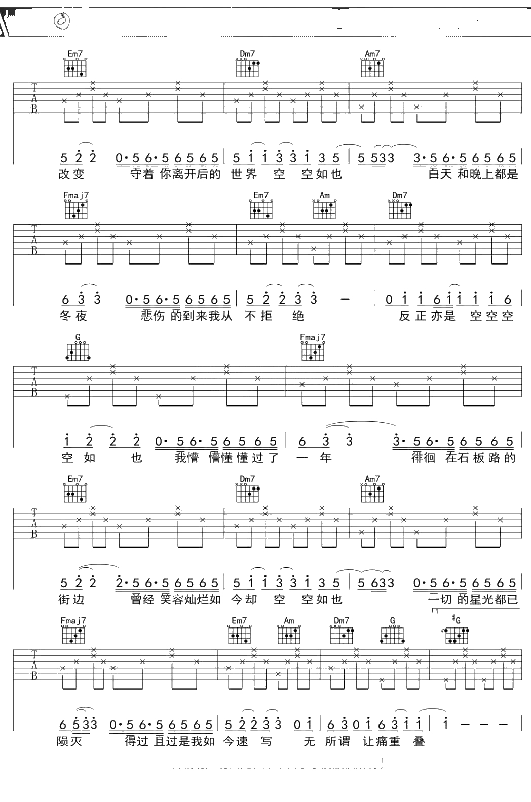 汪峰《空空如也》吉他谱 C调弹唱六线谱