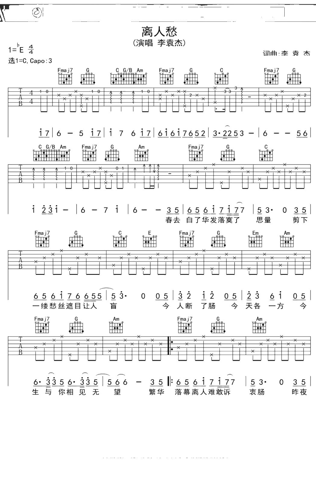 李袁杰《离人愁》吉他谱 C调弹唱六线谱