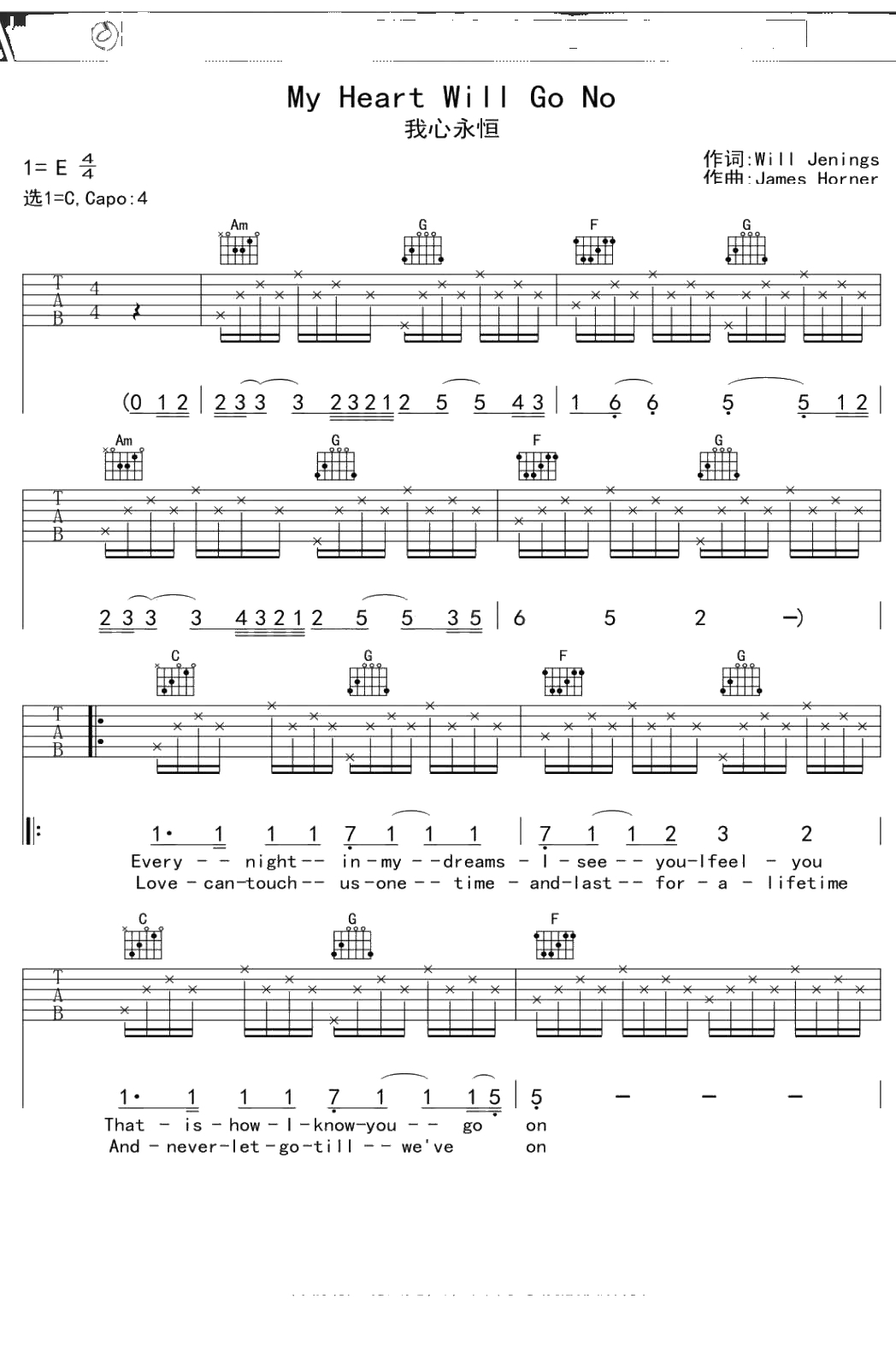 席琳迪翁《My heart well go on》吉他谱 C调弹唱六线谱吉他谱