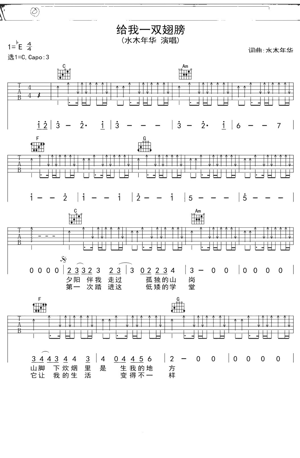 水木年华《给我一双翅膀》吉他谱 C调弹唱六线谱