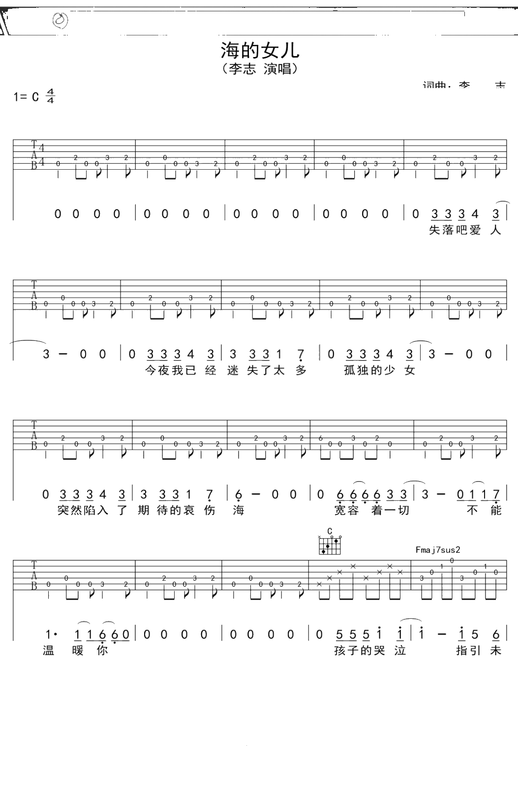 李志《海的女儿》吉他谱 C调弹唱六线谱吉他谱