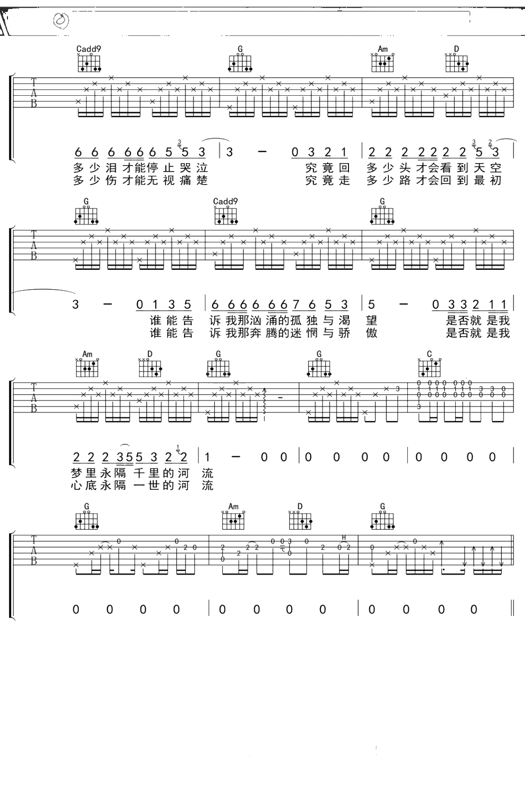 《河流》吉他谱 蒋敦豪版 G调弹唱曲谱