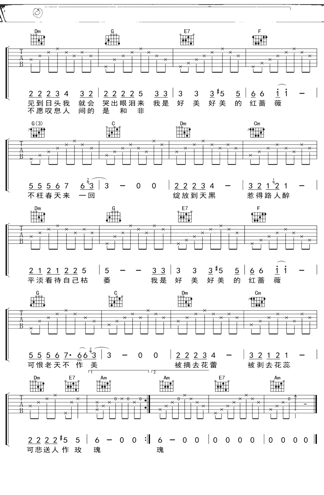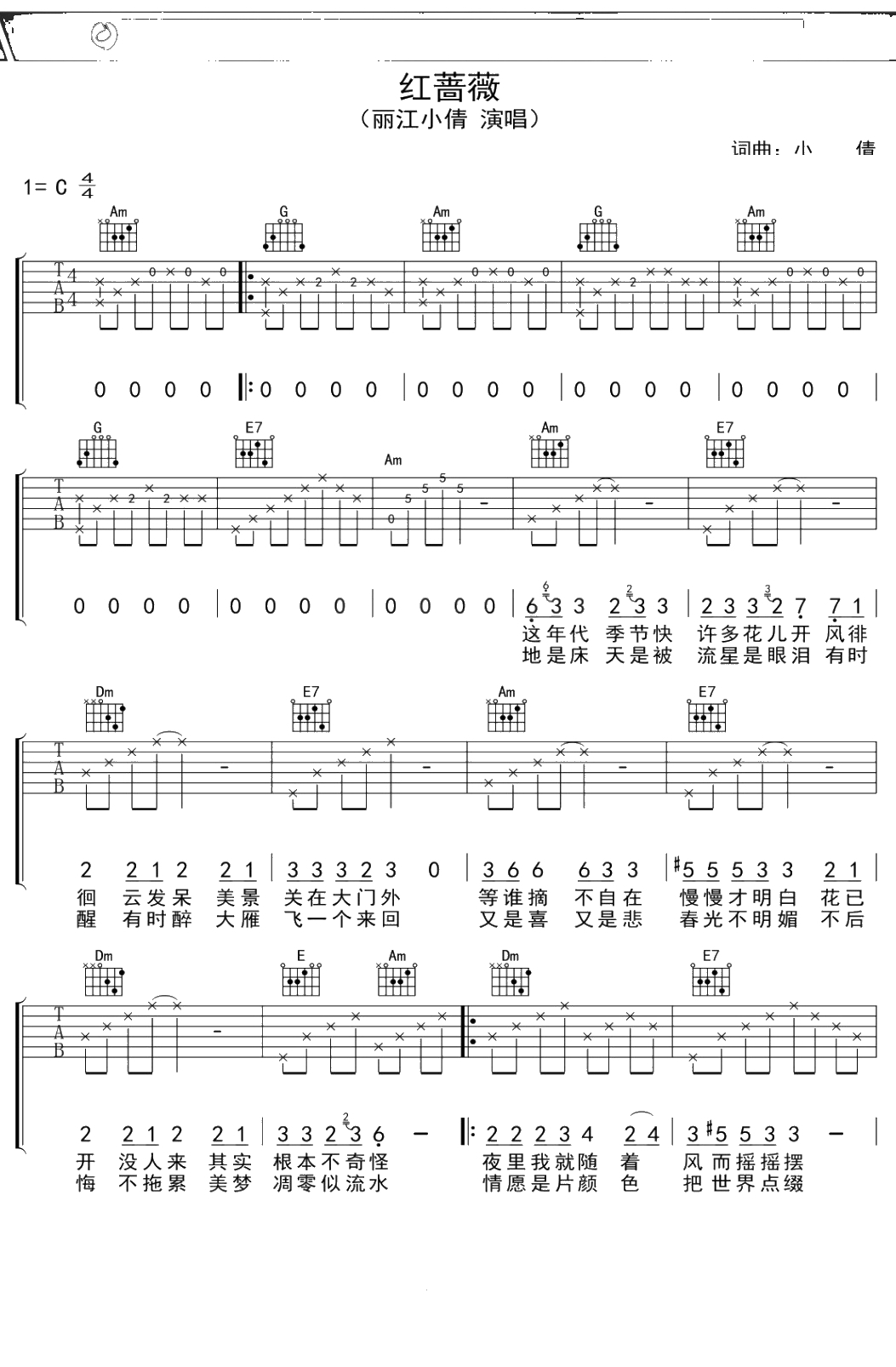 江丽小倩《红蔷薇》吉他谱 C调弹唱六线谱