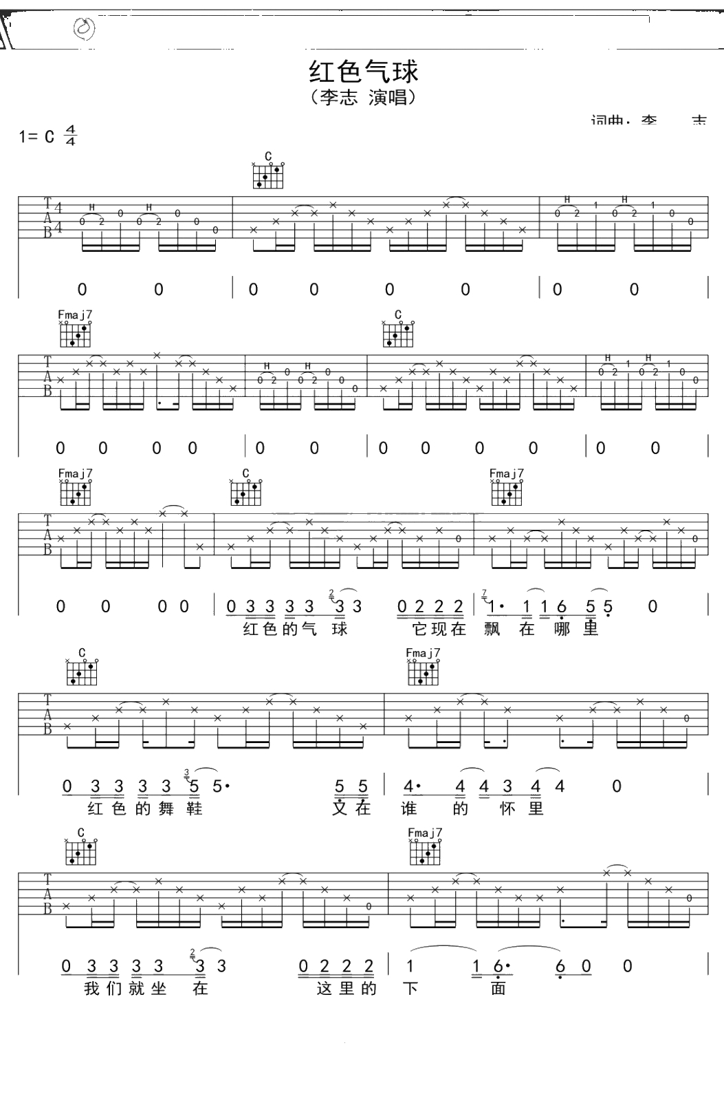李志《红色气球》吉他谱 C调弹唱六线谱吉他谱