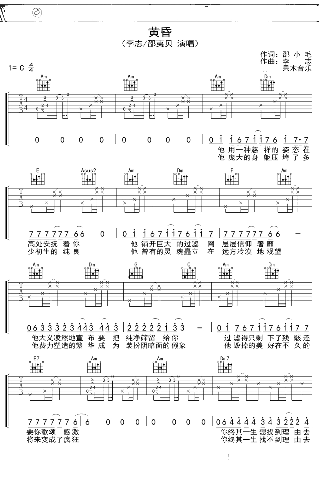 《黄昏》吉他谱 邵夷贝/李志 C调弹唱六线谱